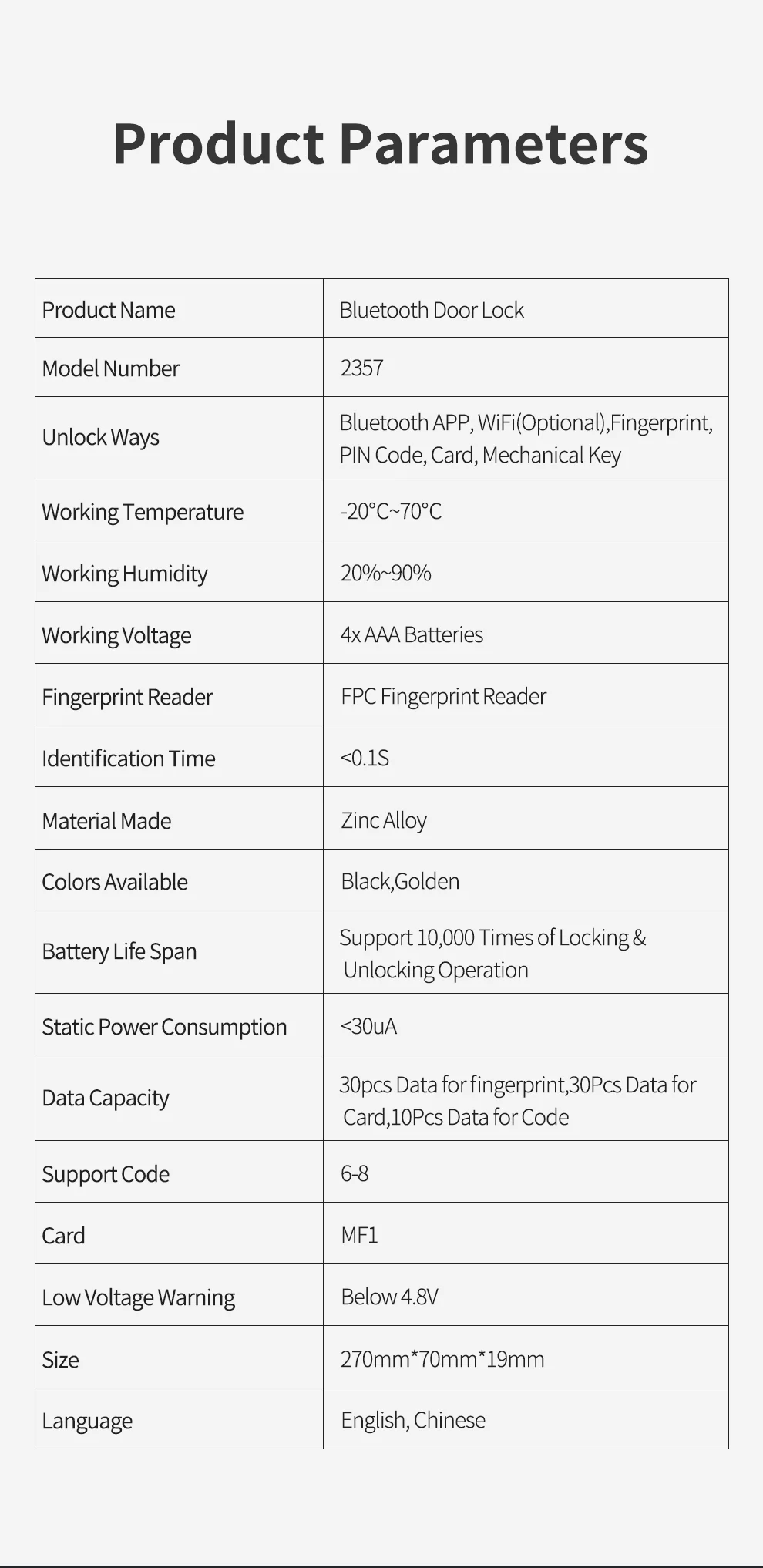 Unlock Ways | WIFI Tuya APP (Optional),Fingerprint, PIN Code, Card, Mechanical Key |