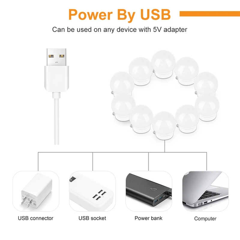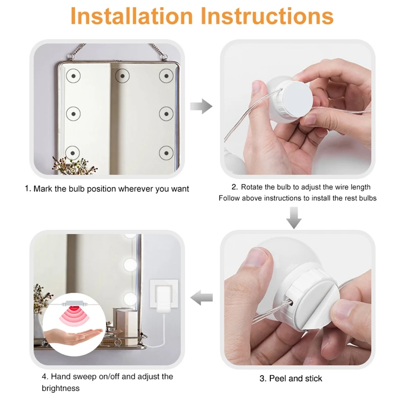 Предусмотрены двухсторонние ленты и присоски, лампочки могут быть непосредственно и быстро наклеены на зеркала с лентами или присосками.