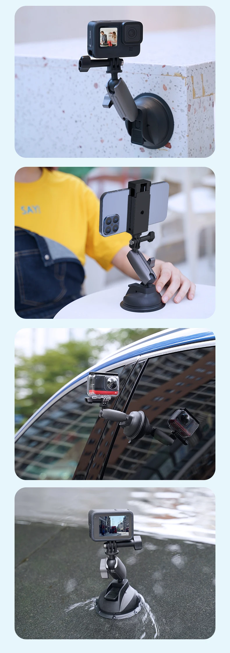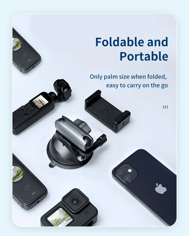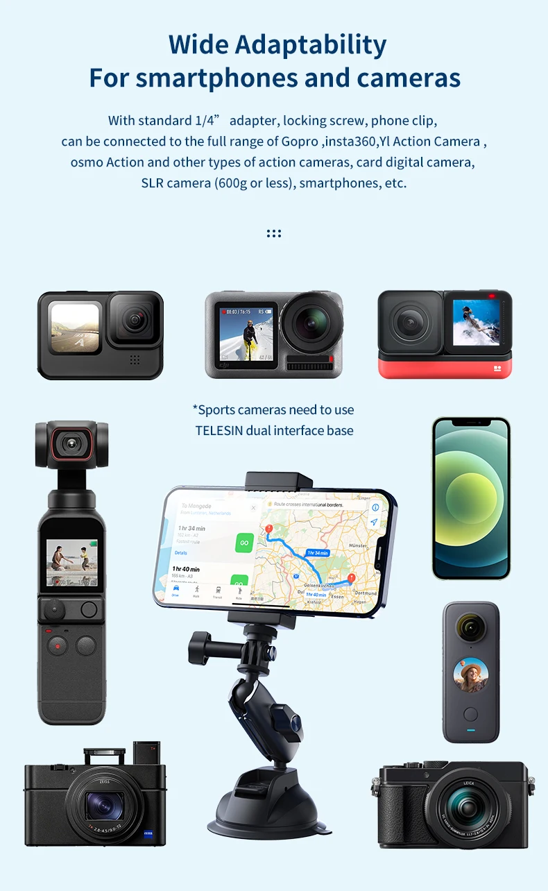 7. Стандартный 1/4 ''адаптер, может подключаться к Gopro и другим экшн-камерам, карточным цифровым камерам, зеркальным камерам (1 кг или меньше), смартфонам и т. д.