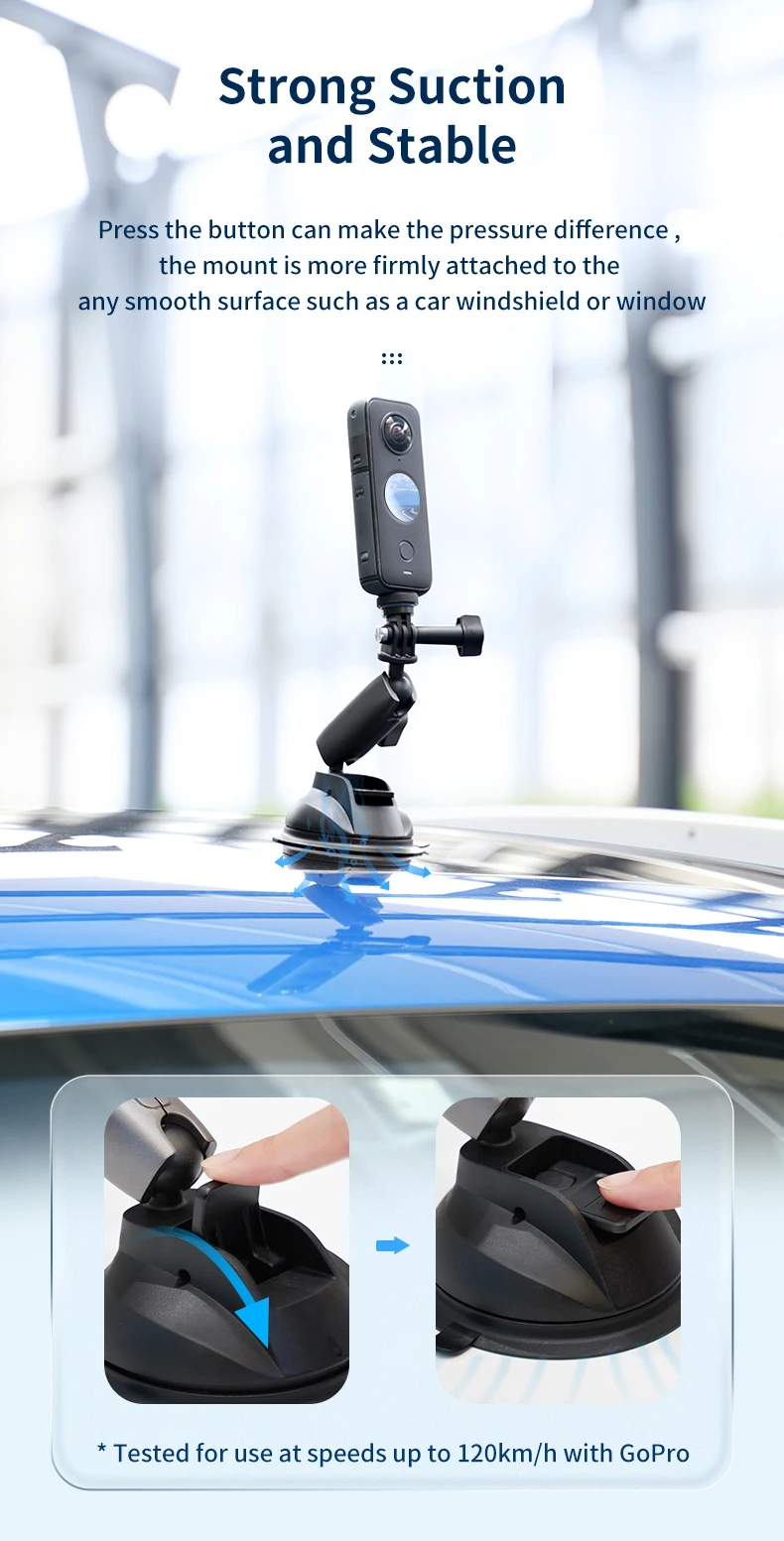 2. Сильное всасывание и Stabl. Нажмите кнопку, чтобы сделать нажатие разница, крепление более прочно крепится к любой гладкой поверхности, такой как лобовое стекло автомобиля или окно.