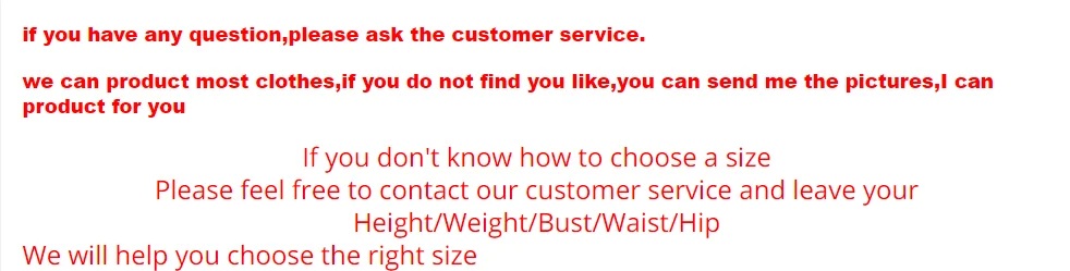 Чтобы убедиться, что вы получили правильный размер, пожалуйста, обратитесь к нашей таблице размеров в описании перед покупкой. Если вы не уверены в размере, пожалуйста, свяжитесь с нами, чтобы определить точный размер тела (рост/Бюст/талия/бедра) чтобы мы могли дать вам несколько предложений о том, как выбрать правильный размер.
