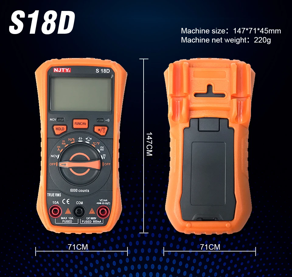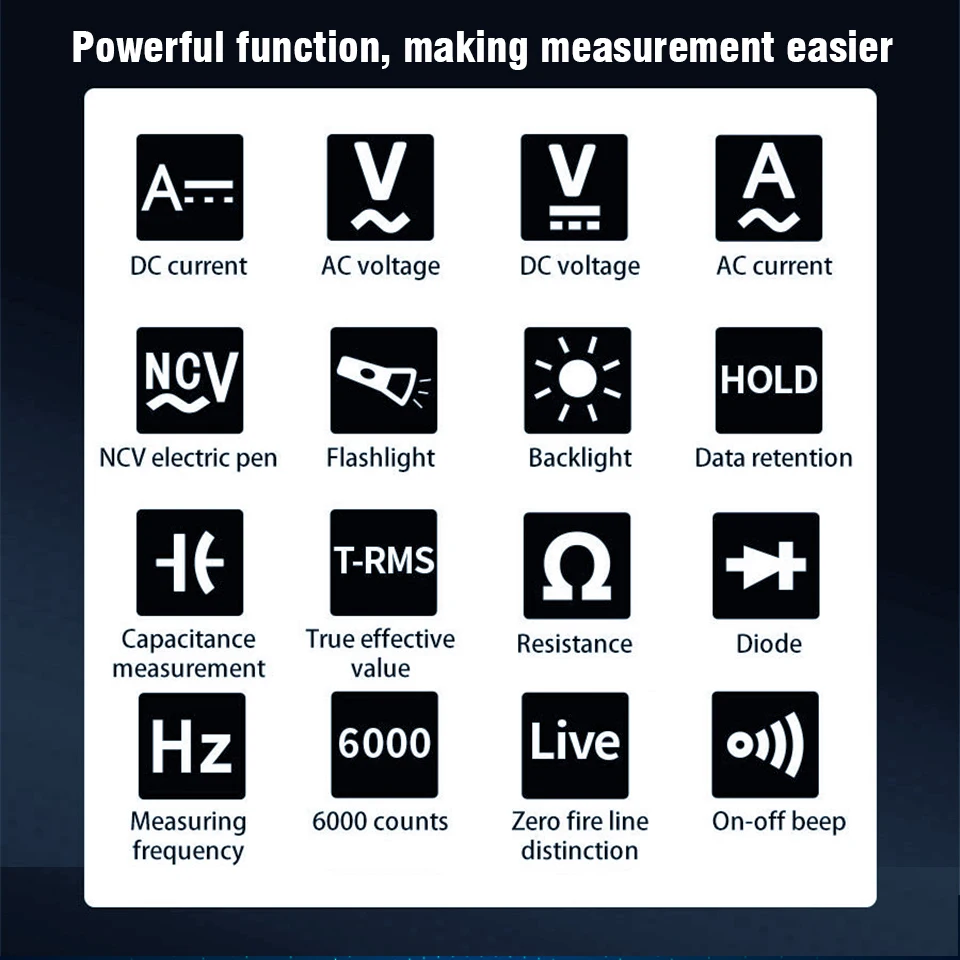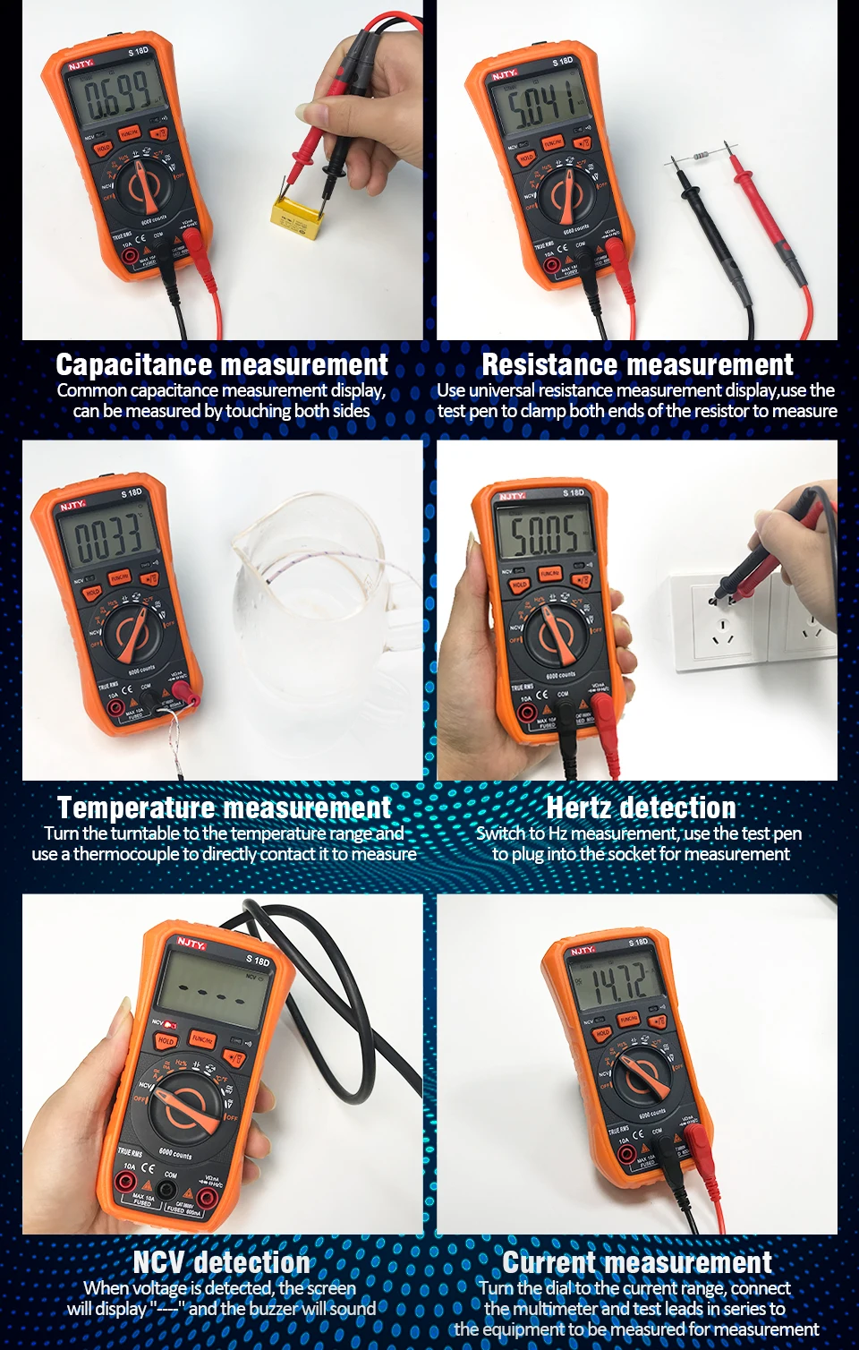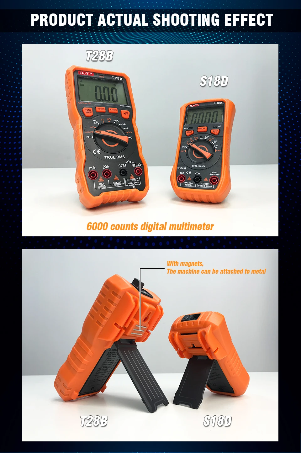 1. Измерение большого диапазона-6000 отсчетов автоматический мультиметр, напряжение постоянного тока до 1000 В, напряжение переменного тока до 750 В, ток переменного/постоянного тока до 10А, сопротивление до 60MΩ, емкость до 100mF, с термопарой типа K, быстрое решение автомобильных и бытовых электрических проблем.