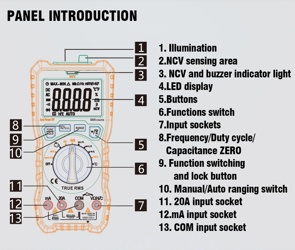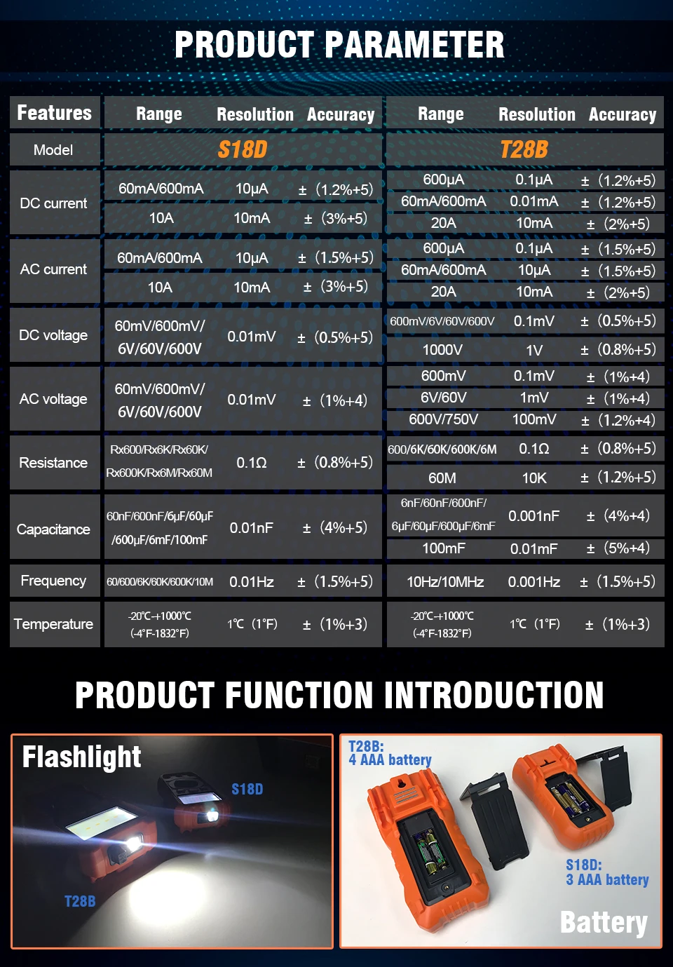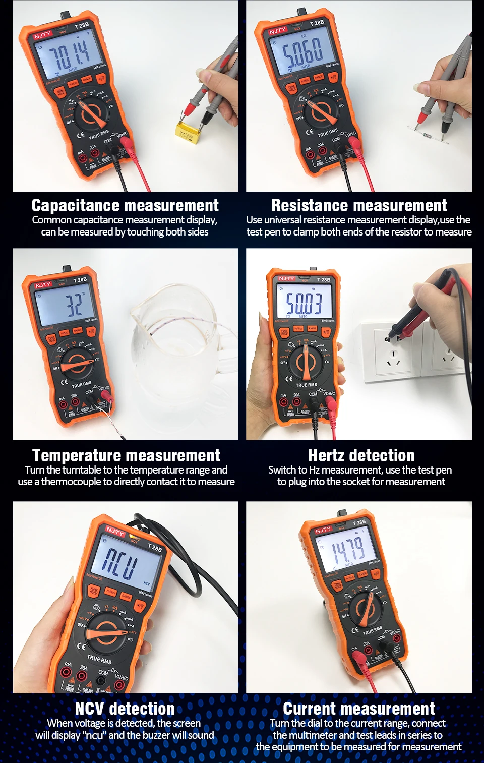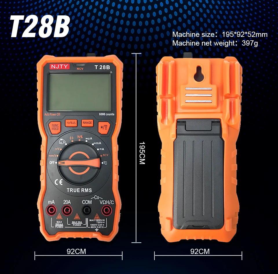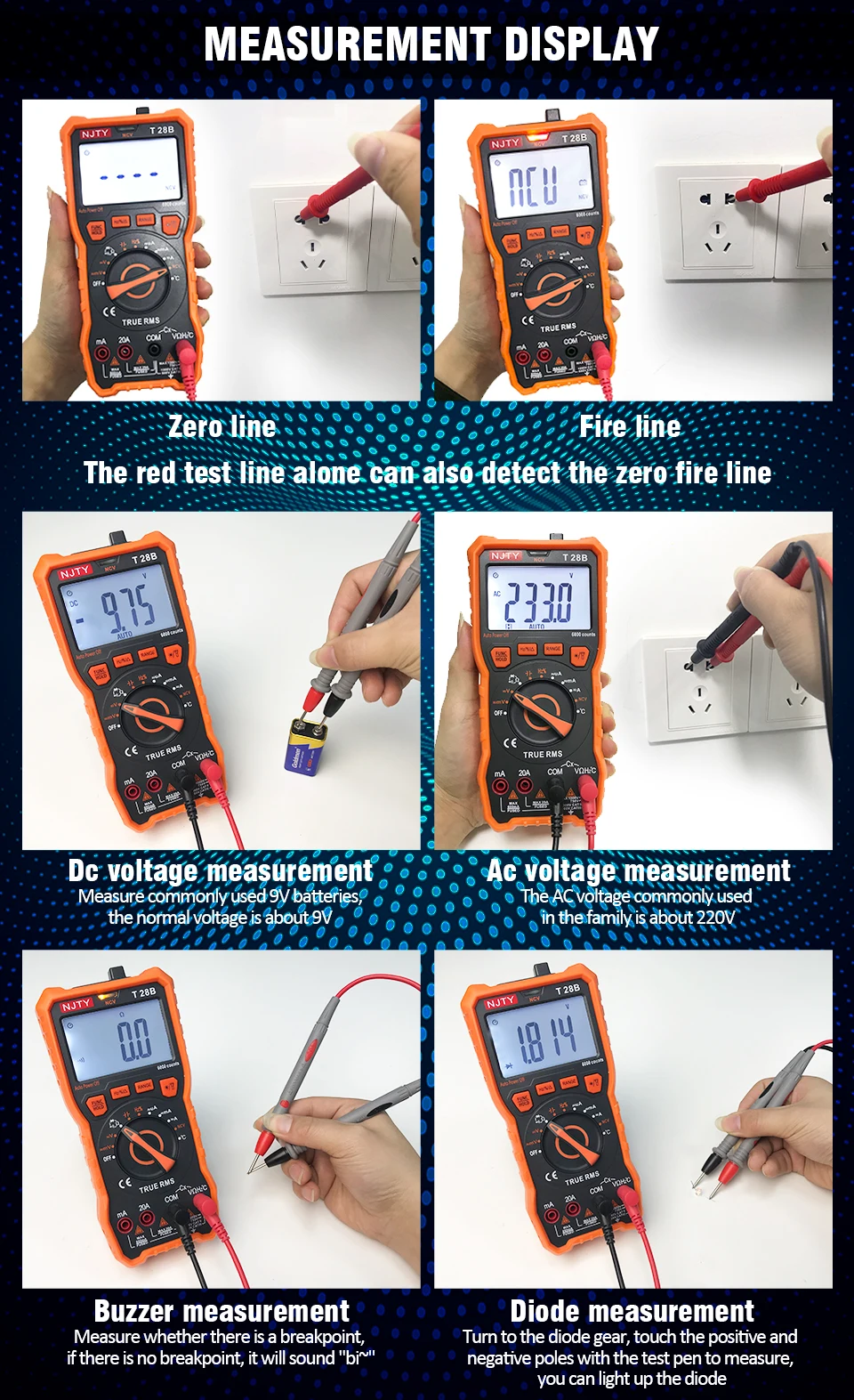 1. Измерение большого диапазона-6000 отсчетов автоматический мультиметр, напряжение постоянного тока до 1000 В, напряжение переменного тока до 750 В, ток переменного/постоянного тока до 10А, сопротивление до 60MΩ, емкость до 100mF, с термопарой типа K, быстрое решение автомобильных и бытовых электрических проблем.