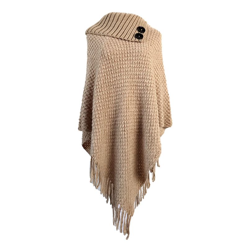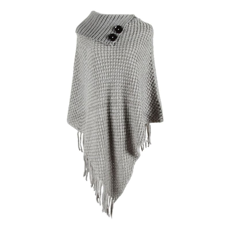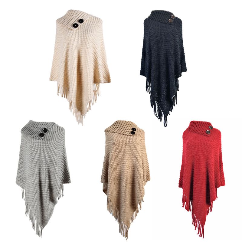 Женский вязаный пуловер, свитер, топ, полуоткрытый воротник, пуговицы, теплая шаль накидка, бахрома, бахрома, подол, однотонный пончо, накидка