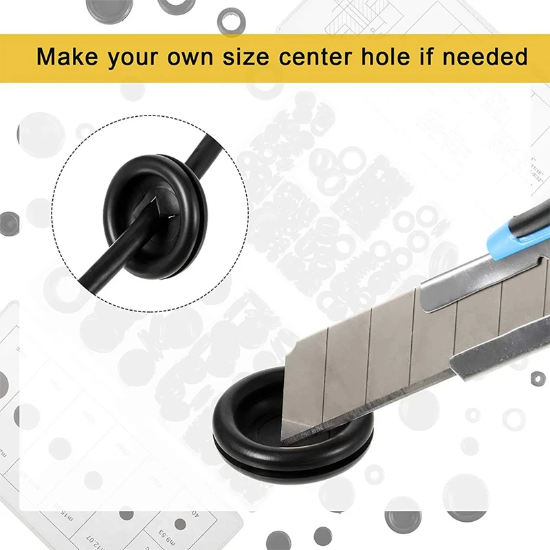 Package content: There are two types of rubber grommets in the package, stored in a plastic box; including rubber grommets without openings and rubber gaskets, rubber grommets are designed to cover holes that are no longer in use and protect cables or wires; ring The gasket is designed to operate through a firewall.