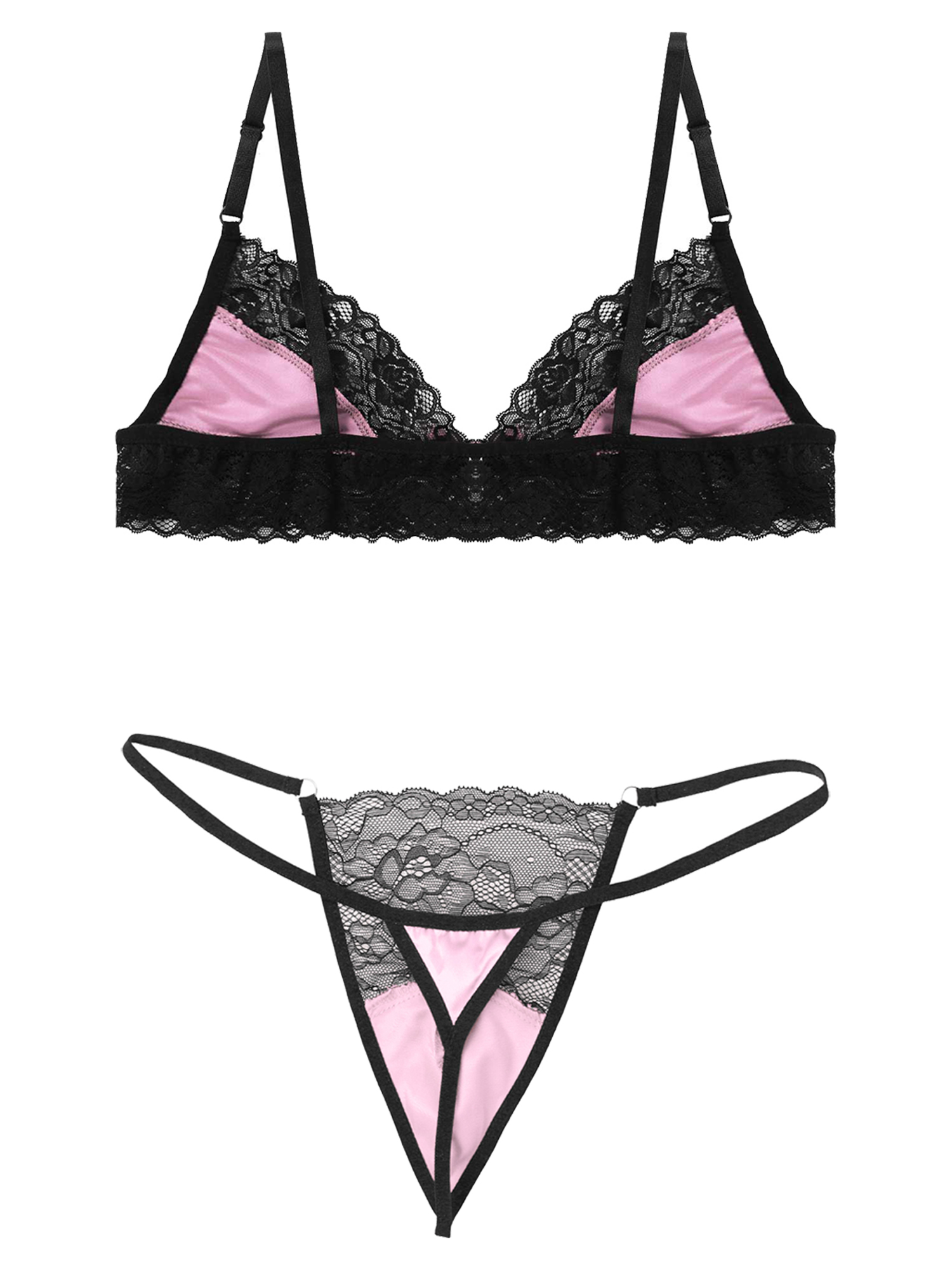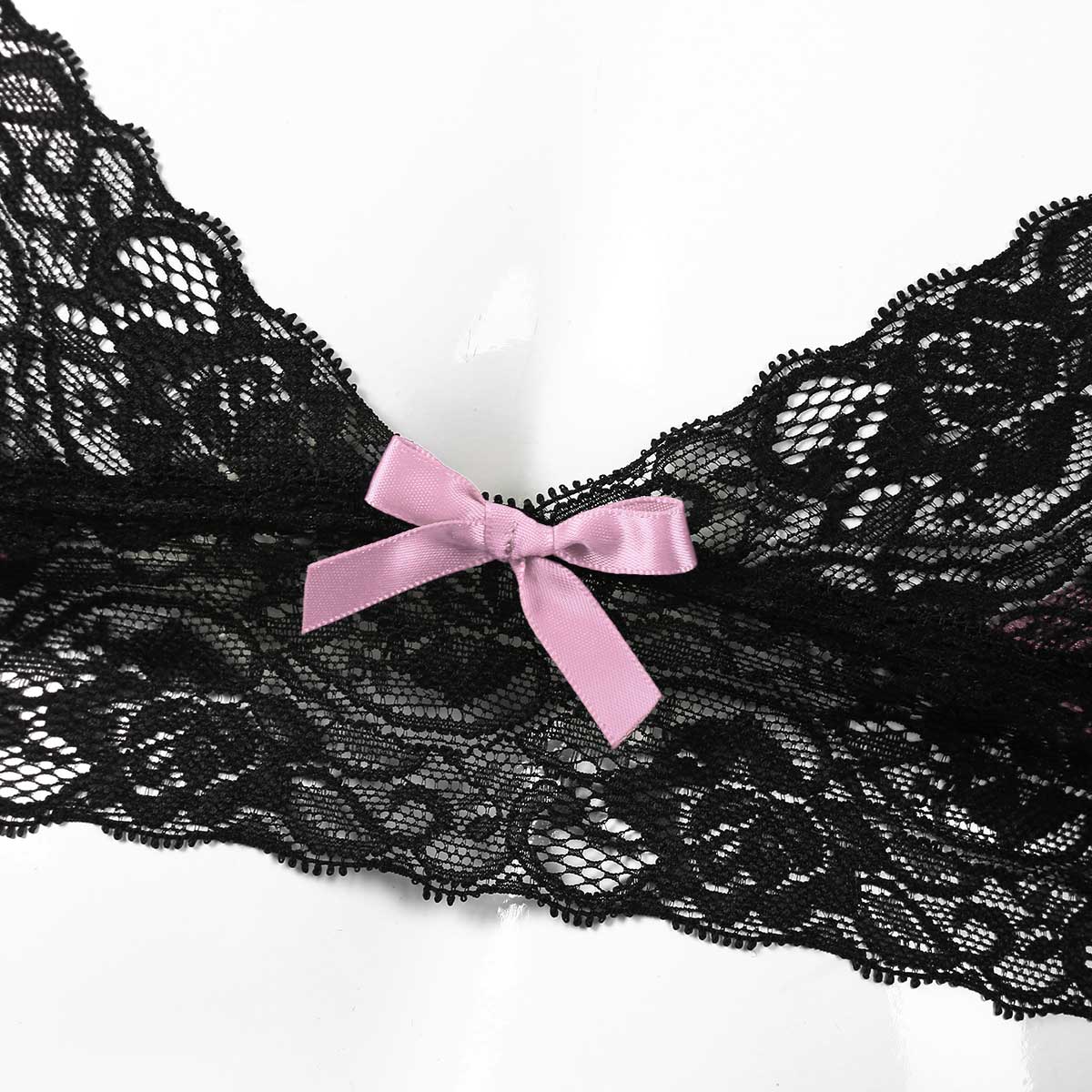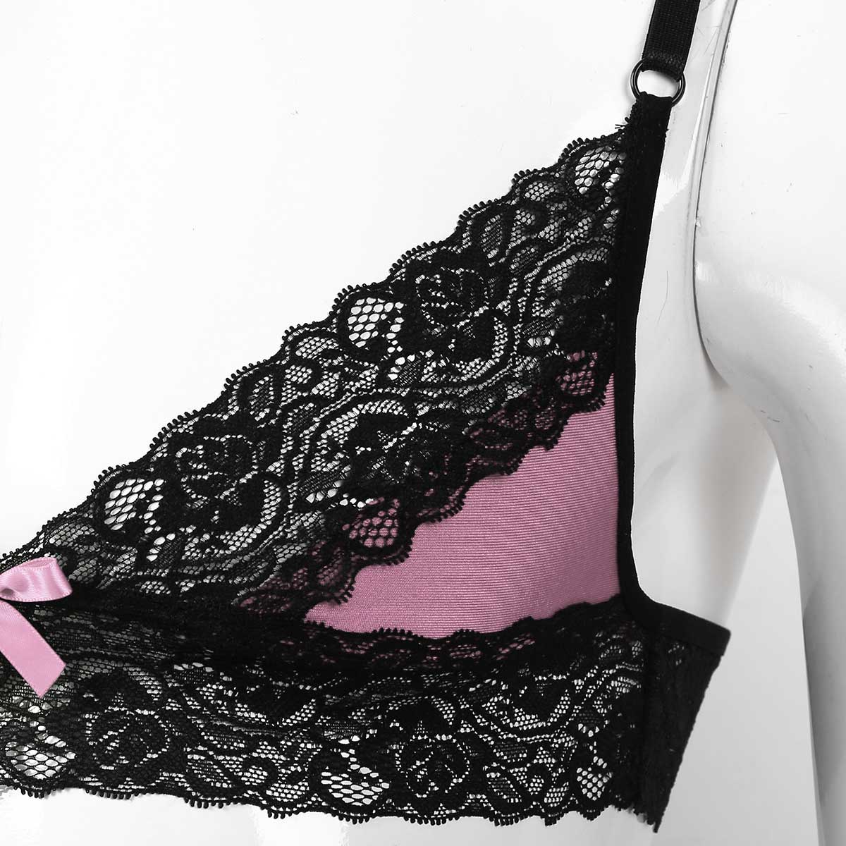Регулируемые бретельки-спагетти, Треугольные чашечки с цветочной кружевной отделкой, застежка-липучка.