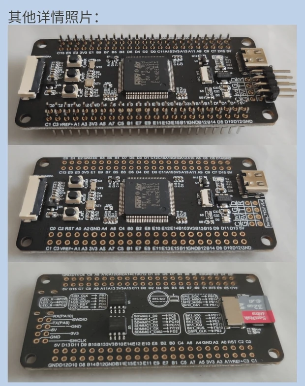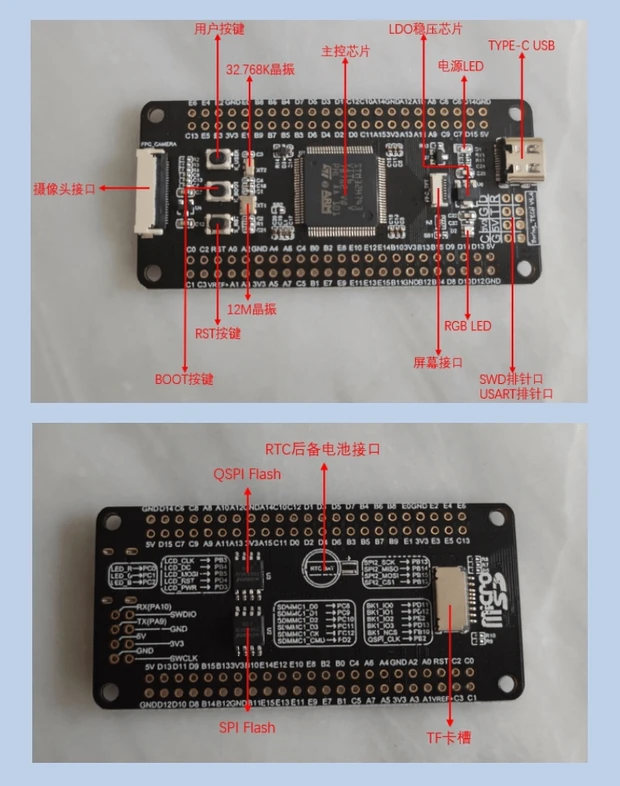Встроенная вспышка QSPI (W25Q64JVSSIQ), вспышка (W25Q64JVSSIQ), слот для tf-карты, TYPE-C usb-порт, 12 м кристалл, 32,768 K кристалл, RGB трехцветный светодиодный, кнопка пользователя, кнопка сброса, кнопка загрузки, интерфейс камеры (DCMI), интерфейс экрана (SPI)
