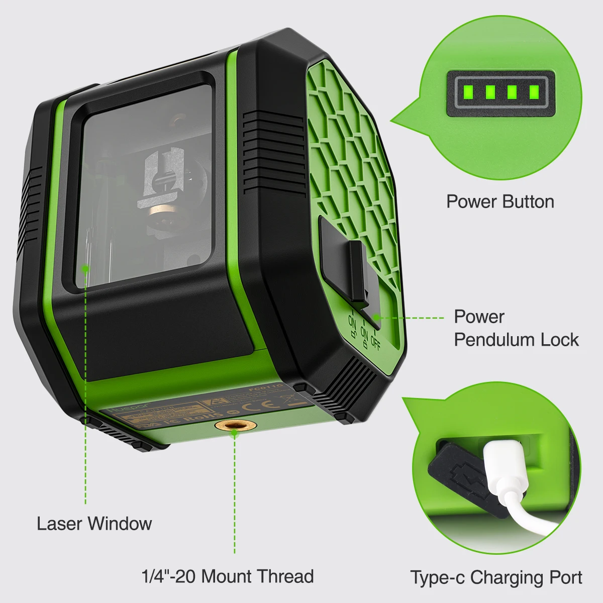 【 Встроенный литий-ионный аккумулятор 】:Перезаряжаемая литиевая батарея обеспечивает длительное время работы FC011G, вы можете легко зарядить лазерный уровень в любом месте с помощью usb-кабеля Type-C.