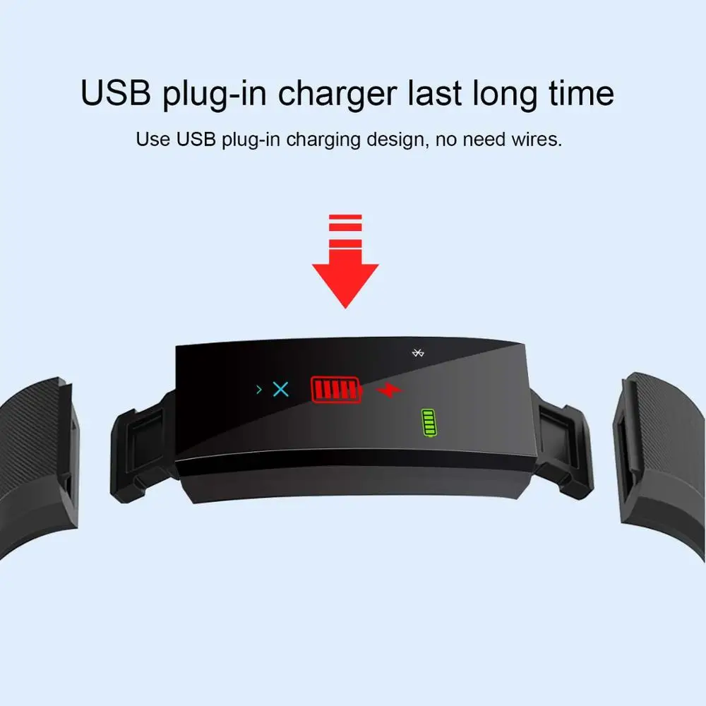 Bracelet Heart Rate Blood Pressure Smart Band Fitness Tracker Smartband Bluetooth Wristband for fitbits Smart Watch Feature: 1.SMS, information, call reminders. 2.Bluetooth synchronization. 3.Data synchronization does not require cable. 4.Remote camera, take photos by phone through remote control of the wristband. 5.Activity tracker, record your daily activity: steps, distance, time, calories; check and share your data anytime. 6.Anti-lost, the wristband will remind you with vibration when your phone is 5m away from you. 7.When the Bluetooth is disconnected or the phone is out of the Bluetooth distance, the watch will alert you. 8.Sleep monitor, check sleep trend chart to view your sleep time and quality. 9.Sedentary reminder, set it to remind you to walk or exercise after a long time sit. 10.IPX7 Waterproof, smart bracelet from water (Not for swimming or taking a shower). 11.Heart rate monitor and blood pressure monitor. 12.USB direct charge. Specification Device model: ID 115PLUS heart rate bracelet Bluetooth: 4.0 Battery: 50mA Polymer Lithium-ion Charging Time: 1 hour Waterproof: Life Waterproof Compatible system: for IOS7.1 and above,for Android4.4 and above Synchronization Range: 3m(theoretical rang is 10m without any interference) Main functions: heart rate monitoring, step counting, calorie burning, distance, RTC display, automatic sleep monitoring, call reminder, information push, alarm reminder, anti-lost, remote control, etc. Waterproof and dustproof: sweatproof, rainproof, splashproof Display screen size: 0.96 inches Screen type: OLED Connection parameters: Bluetooth Low-power Bluetooth 4.0 synchronization Other parameters: appearance material TPE Product size: Main body: 43x18x12mm, Strap: 245x20x12.8mm Product net weight: 28g Product color: black, red, purple, blue, green Other features: touch screen: full touch screen Control mode: button switch Data Storage: Record 7 days of detailed exercise data Battery type: polymer lithium battery Charging method: USB charging Packing list: 1* ID115plus smart bracelet 1* Instruction manual