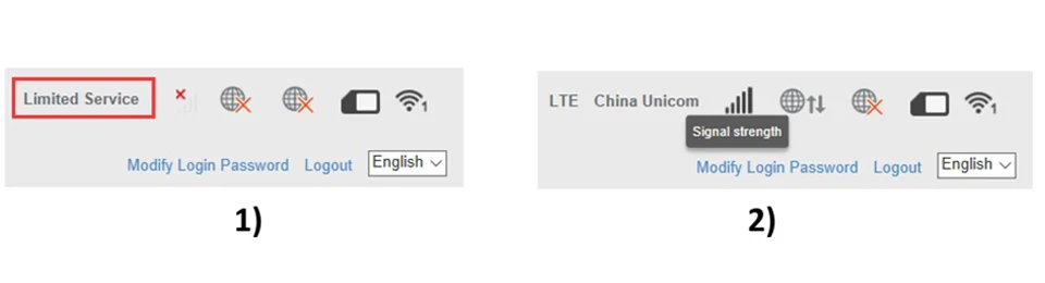 ②Частота не поддерживается или просрочка sim-карты при запросе «Нет обслуживания» или «ограниченная услуга», как показано ниже 1):