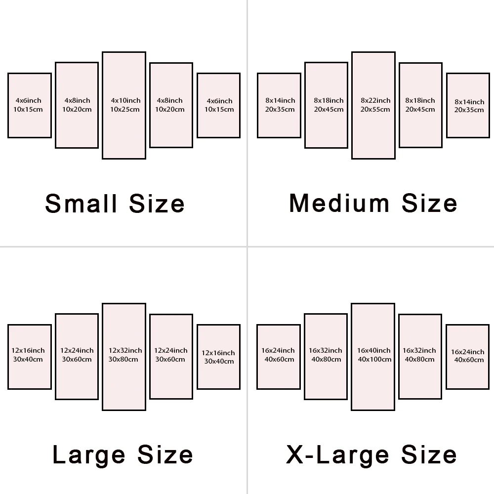 Small Size: 10×15cm ×2, 10×20cm ×2, 10×25cm ×1 (4×6in×2,4×8in×2,4×10in×1) Medium Size: 20×35cm ×2, 20×45cm ×2, 20×55cm ×1 (8×14in×2,8×18in×2,8×22in×1) Large Size: 30×40cm ×2, 30×60cm ×2, 30×80cm ×1 (12×16in×2,12×24in×2,12×32in×1) X-Large Size: 40×60cm ×2, 40×80cm ×2, 40×100cm ×1 (16×24in×2,16×32in×2,16×40in×1)