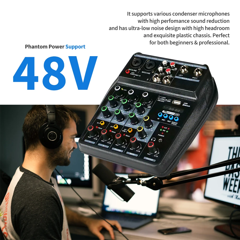 Миксер встроен в звуковую карту и usb-аудиоинтерфейс для записи сверхнизкого уровня шума с этой микшерной консоли на ПК/ноутбук. Встроенные элементы управления для воспроизведения/паузы/переключения между режимами.