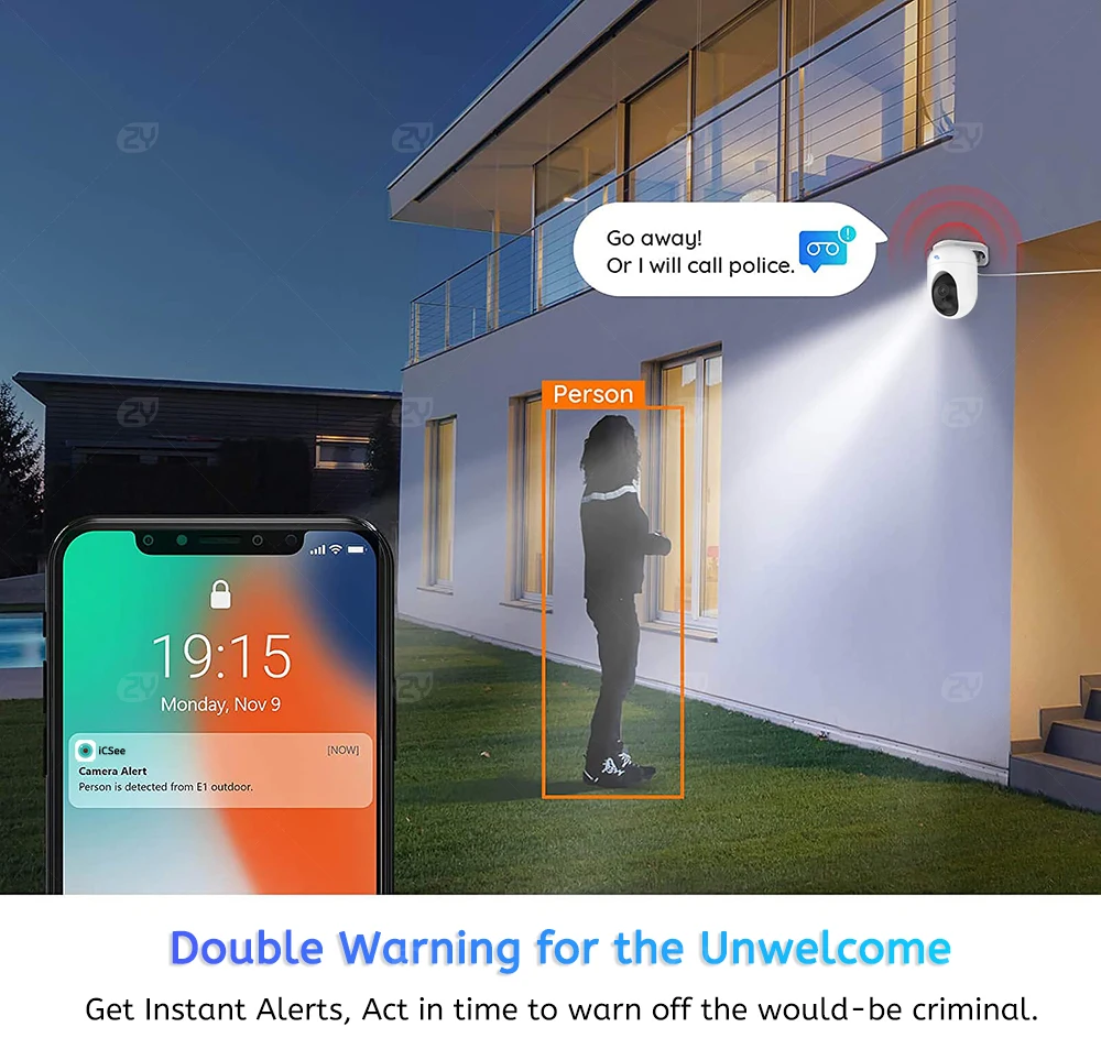 После обнаружения нарушителя сирена камеры будет срабатывать или активироваться вручную, чтобы предостеречь потенциального нарушителя. Прекратите это деяние до того, как оно произойдет.