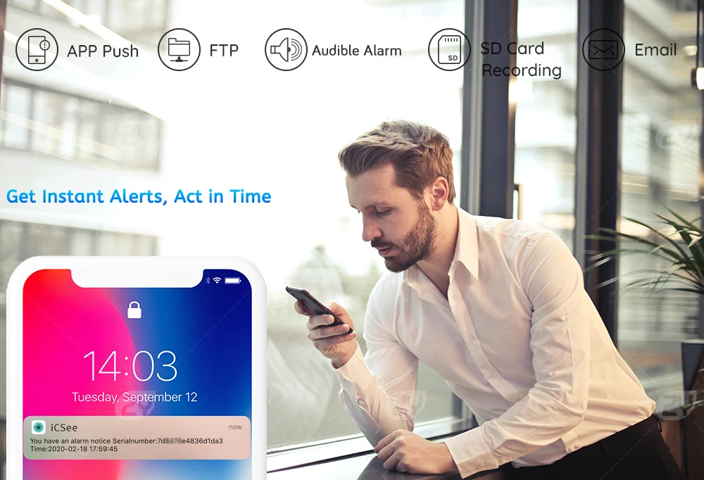 Оповещения о сообщениях в режиме реального времени будут отправлены на ваш телефон. Как только Вы активируете функцию обнаружения движения, камера безопасности автоматически снимет и записывает видео.