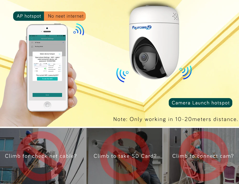 Ip-камера ZYsecurity поставляется с qr-кодом, который можно отсканировать с помощью мобильного устройства с помощью нашего бесплатного приложения (iOs и Android). Эту беспроводную камеру можно легко и быстро настроить. Вы можете наслаждаться свободой, чтобы разместить его в любом месте вашего дома, подключите его к сети Wi-Fi, чтобы начать мониторинг в течение одной минуты (только поддерживает 2,4G Wi-Fi)