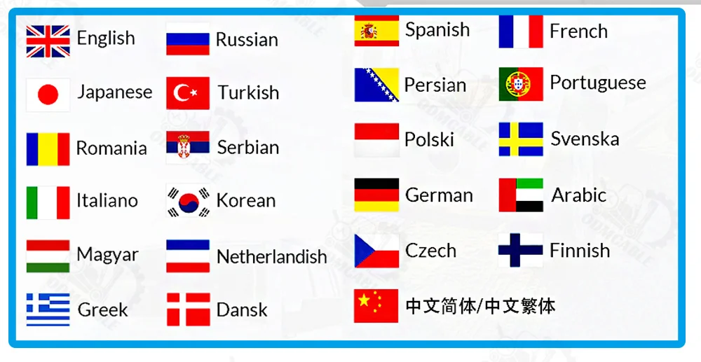 Английский, французский, испанский, немецкий, русский, корейский, японский, португальский, итальянский, польский, голландский, венгерский, финский, Упрощенный, чешский, турецкий, греческий, арабский, датский персидский, румынский, сербский, шведский, Китайская традиционная. Полностью локализованный 24 Язык s свободно использовать, чтобы выбрать свой родной язык, не сталкиваясь с каким-либо языковым барьером.
