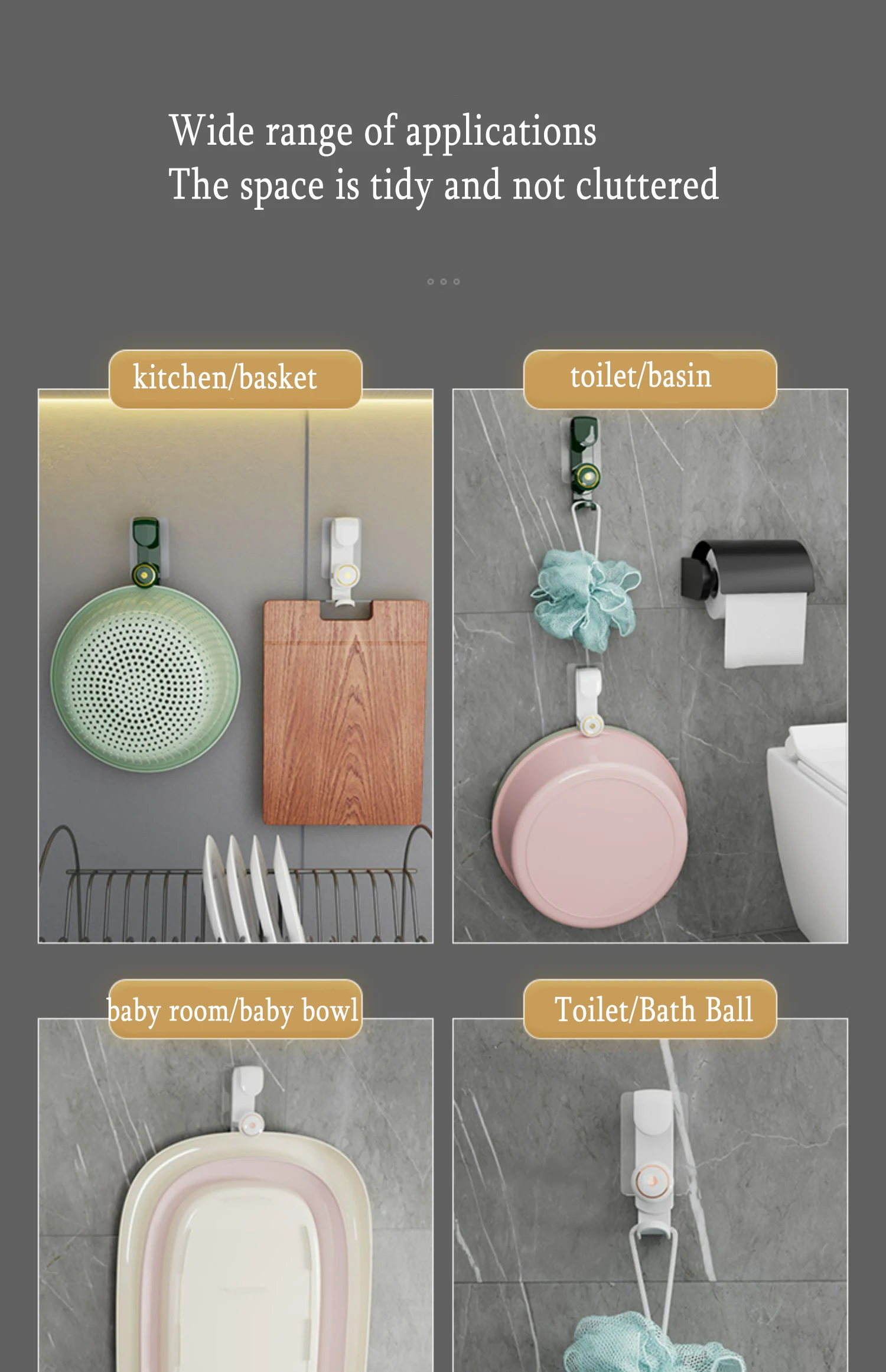 Features: Double layer can be hung, no drilling installation method, strong adhesive, waterproof and moisture-proof, small body is very useful, one adhesive hook can handle multiple washbasins, the distance between the hooks can be adjusted at will, no trace does not hurt the wall, stable No drop, neat and tidy storage, wide application range, clean and uncluttered space, suitable for various scenarios, rounded corners.