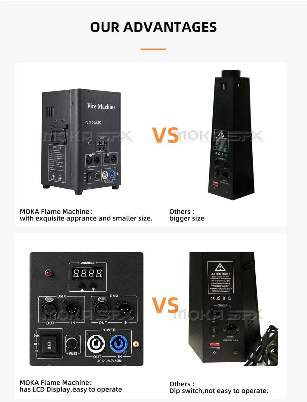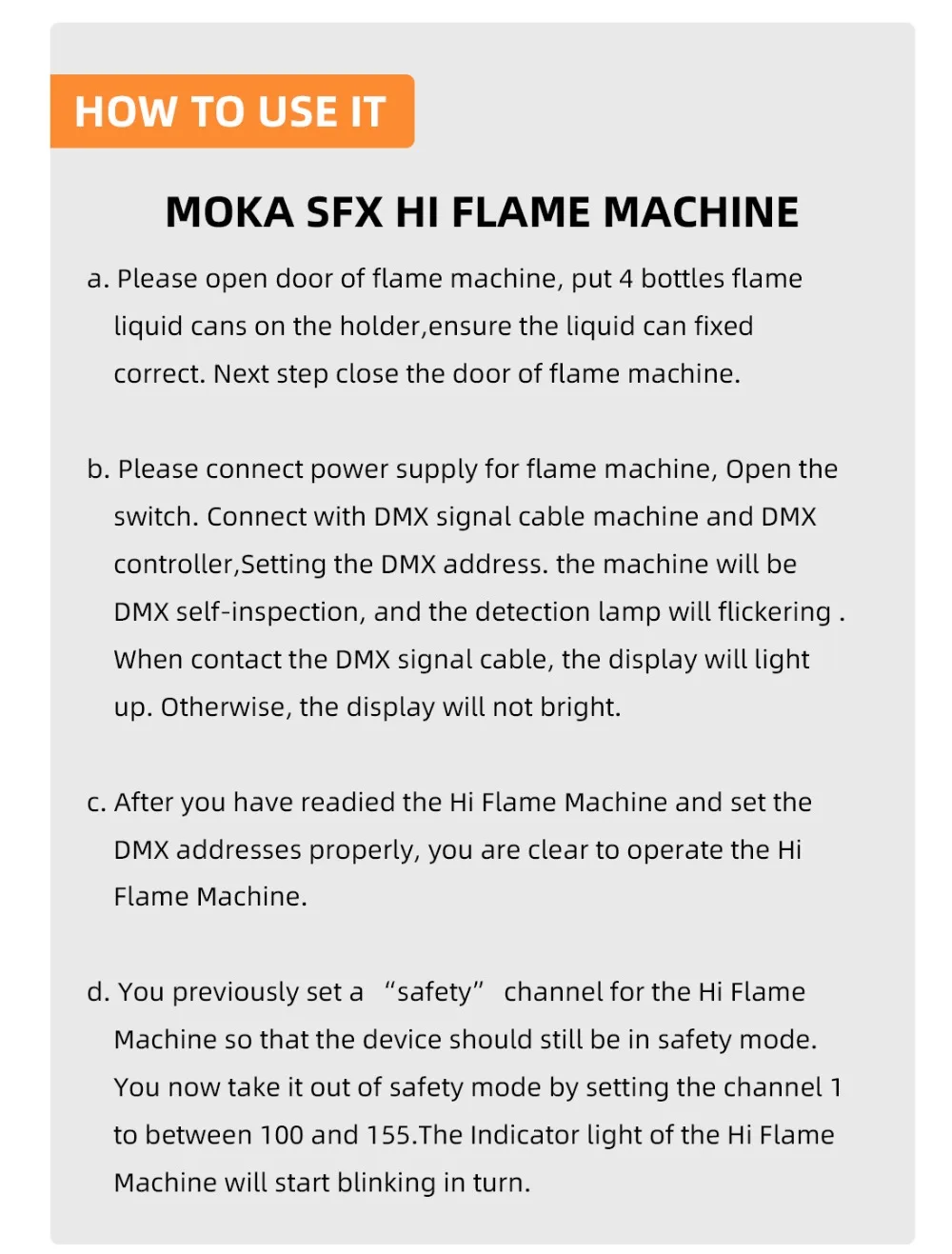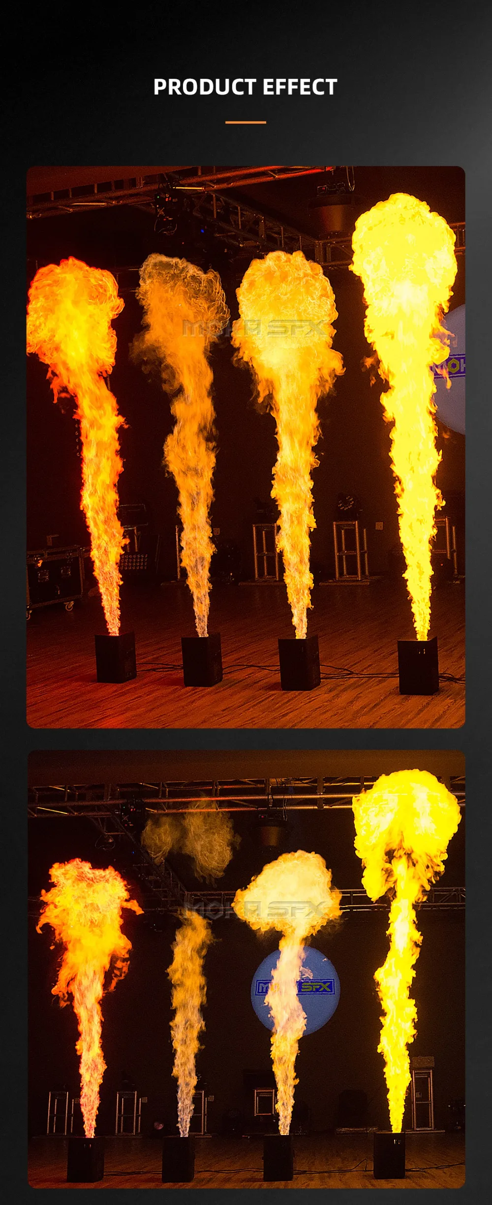 Машина пламени может быть пригодна для различных телевизионных представлений, большого или среднего размера на открытом воздухе диско-шоу и концертов, вечеринки и т. д. это важный элемент сценических эффектов. Вид пожарных машин создает великолепное и красивое пламя, высота пламени может достигать 3 метров (10eet).