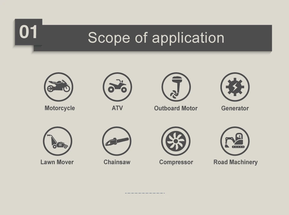 Также используется для насосов, генераторов, косилок, модельных лодок, мотоциклов, скутеров, очистителей и бензопил.
