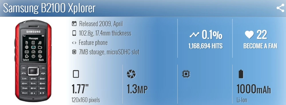 Общая Сеть 2G GSM 850 / 900 / 1800 / 1900 Сим мини сим Анонсировано 2009, март Статус Доступен. Выпущено 2009, апрель Размеры корпуса 113x48,9x17,4 мм (4,45x1,93x0,69 дюйма) Вес 102,8 г (3,60 унции) -MIL-STD-810F сертифицирован-соль, пыль, влажность, дождь, вибрация, солнечное излучение, транспортировка и термостойкость -Сертификация IP57-защита от пыли и воды (до 1 м в течение 30 минут) -Противоударные материалы (уретан) -Фонарик Тип дисплея TFT, 256K цветов Размер 120x160 пикселей, 1,77 дюйма (плотность пикселей ~ 113 ppi) -Обои Типы звукового оповещения Вибрация; Полифонический (64), мелодии мелодий MP3 Громкоговоритель да Разъем 3,5 мм Нет Слот для карт памяти microSD, до 8 Гб Телефонная книга 1000 записей Запись вызовов да Внутренний 7 МБ ДАННЫЕ GPRS класса 10 (4 + 1/3 + 2 слота), 32 - 48 кбит/с Класс кромки 10, 236,8 кбит/с WLAN нет Bluetooth Да v2.1 с A2DP USB Да, v2.0 Основная камера 1,3 MP, 1280x1024 пикселей, вспышка Видео да, 15fps Вторичный номер Функции обмена сообщениями SMS, MMS Браузер WAP 2,0/xHTML Радио стерео FM-радио с RDS Игры Да + загружаемые GPS Нет Java да, MIDP 2,0 Цвета красный, черный -Шумоподавление с помощью выделенного микрофона -Секундомер -Плеер MP3/eAAC +/WMA/WAV -Плеер MP4/3GP/M4V -Голосовая памятка -Предсказательный ввод текста