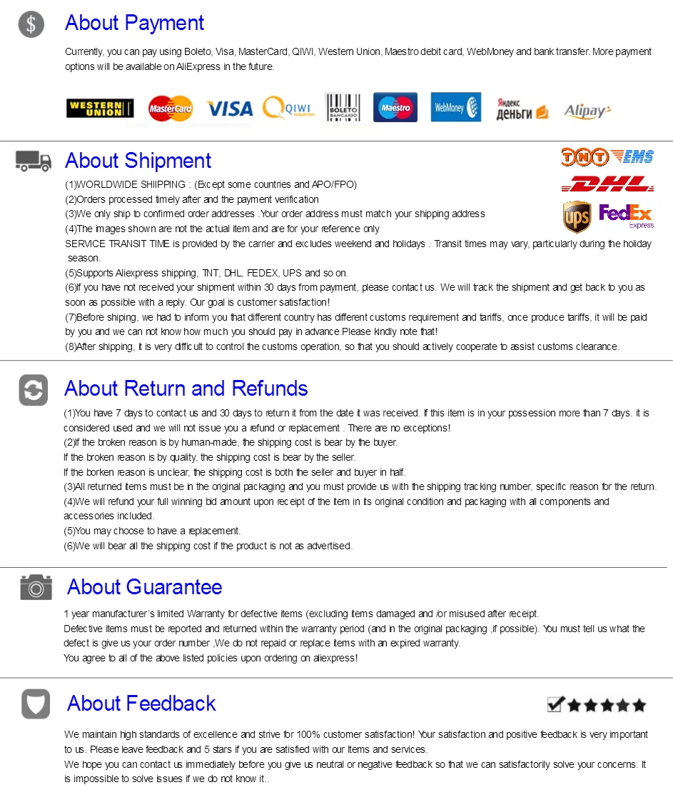 Мы поддерживаем высокие стандарты качества и стремимся к 100% удовлетворенности клиентов! Отзывы очень важны для нас. Вы немедленно свяжитесь с нами. Вы даете нам нейтральные или негативные отзывы, чтобы мы могли удовлетворительно решить ваши проблемы. Невозможно решить проблемы, если мы не знаем о них