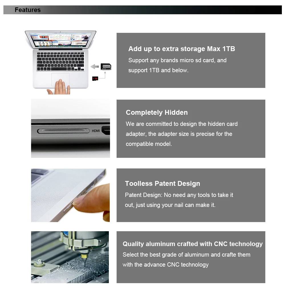 BASEQI Aluminum MiniDrive Micro SD Card Adapter Memory Card Reader For Macbook Air 13'' Model 103A