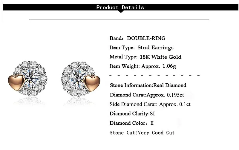 Двойное кольцо, 18K, белое золото, серьги, Круглые, 0.195ct, настоящее Бриллиантовое сердце, ювелирные украшения, свадебный подарок, бижутерия, CASE10055KA-7