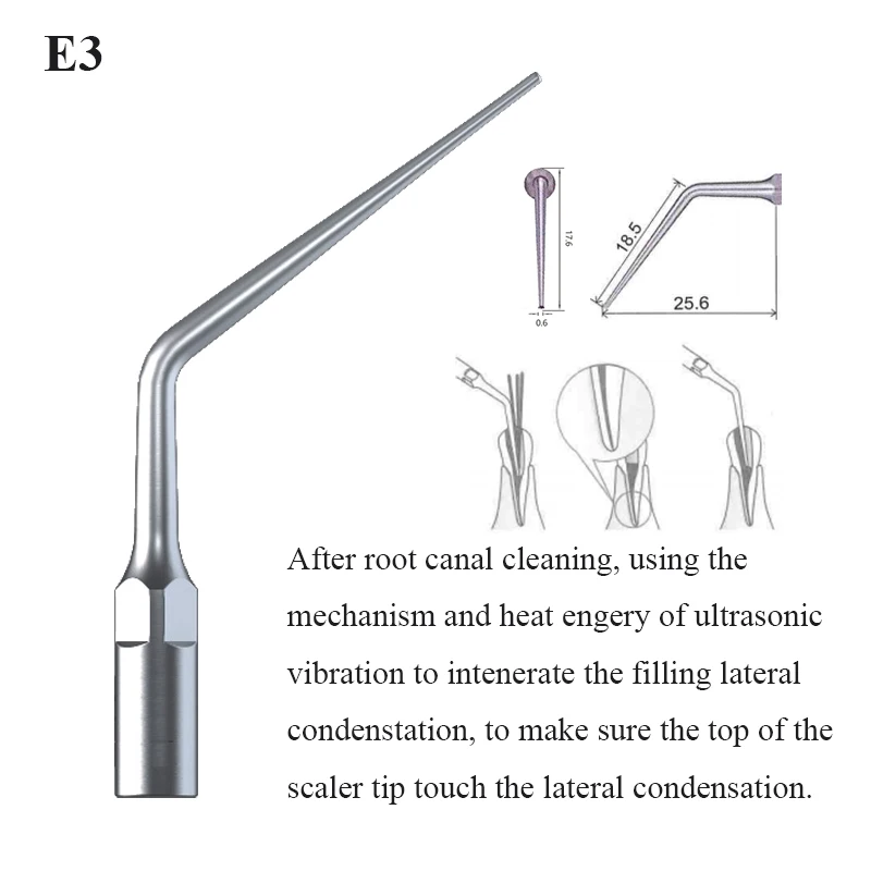 Модель: EEKSКомплект Endo Tip ScalerE0, Endo tip,(держатель угла 180) для хвостовика диаметром 0,57 мм × 0,57 мм K файлы, обычно используются для очистки переднего корневого канала, стерилизации и извлечения стебля в корневом канале.E1,Endo tip,(держатель угла 120) для хвостовика диаметром 0,57 мм × 0,57 мм K файлы, обычно используются для очистки переднего корневого канала, стерилизации и извлечения стебля в корневом канале.E2, Endo tip,(держатель угла 90) для хвостовика диаметром 0,57 мм × 0,57 мм K файлы, обычно используются для очистки переднего корневого канала, стерилизации и извлечения стебля в корневом канале.E3, Endo tip, после очистки корневого канала, с помощью механизма и нагрева ультразвуковой вибрации для активизации боковой конденсаторной станции заполнения, чтобы убедиться, что верхняя часть наконечника скейлера касается бокового конденсата.P4D, наконечник Endo, заменяет традиционный расширитель, используется для подготовки хороших эндо-зажимов.E3D, Endo tip, удаляет кальцификацию и плохой заполняющий материал полости целлюлозы, камеру Свеса целлюлозы.![]()