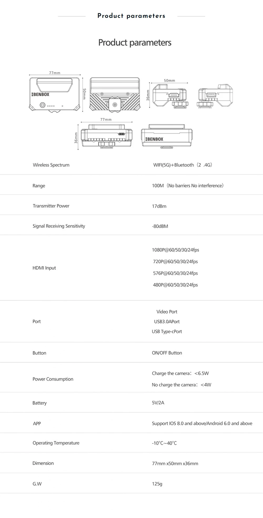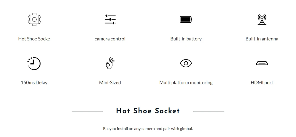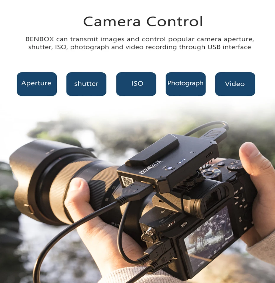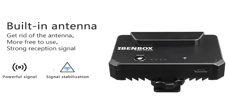 듀얼 채널 무선 비디오 송신기 내장 배터리 및 안테나 저 지연 미니 무선 비디오 송신기 핫슈 소켓 모든 카메라에 설치가 쉽고 짐벌과 페어링 카메라 제어 BENBOX는 USB 인터페이스를 통해 이미지를 전송하고 인기있는 카메라 조리개 셔터 ISO 사진 및 비디오 녹화를 제어 할 수 있습니다