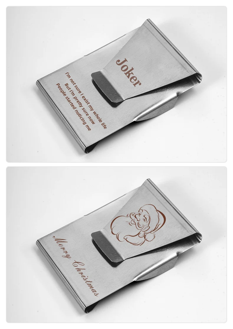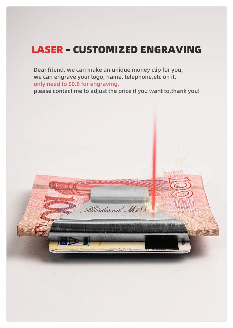 Дорогой друг, мы можем сделать уникальный зажим для денег для вас, вы можете выгравировать ваш логотип, имя, телефон и т. д. на нем, только нужно $0,8-1,6 для гравировки, пожалуйста, свяжитесь со мной, чтобы скорректировать цену, если вы хотите, спасибо!