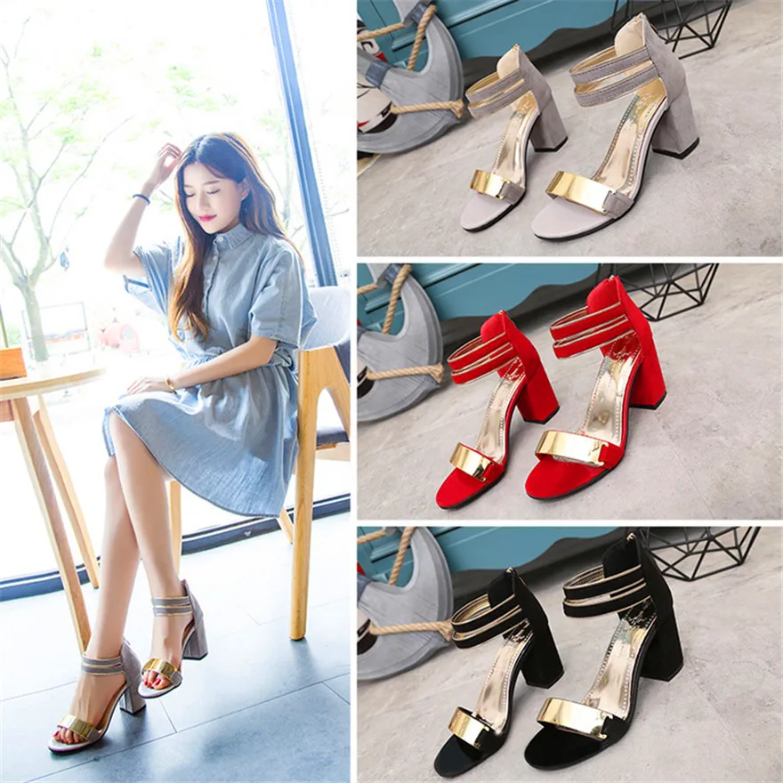 Римские сандалии на толстом каблуке с металлическими украшениями; Женские модные сандалии из флока на молнии сзади; Вечерние женские модельные туфли с открытым носком на высоком каблуке