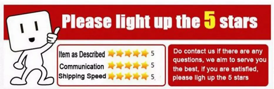 Ваши отзывы очень важны для развития нашего бизнеса, мы искренне приглашаем вас оставить нам положительные отзывы с пятью звездами, основываясь на вашем удовлетворении нашим товаром и обслуживанием. К сожалению, если вы Планируя дать нам нейтральный/отрицательный отзывы из-за вашего плохого опыта покупки с нами, пожалуйста, свяжитесь с нами в любое время, чтобы очистить ваше недовольство и решить проблему.