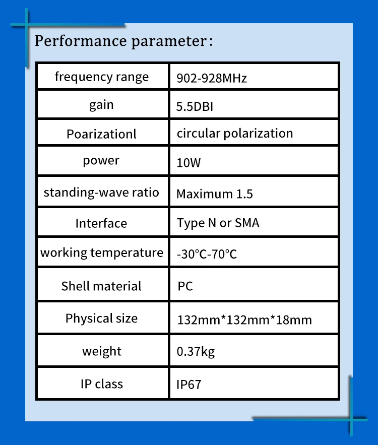 VIKITEK антенна радиочастотной идентификации ультравысокой частоты EPC C1G2 ISO18000-6c 915 МГц 902-928 МГц контроля доступа кард-ридер смарт-карт тег сканер Средний диапазон радиочастотной идентификации ультравысокой частоты Частота: 902-928 МГц Размеры: 132*132*18 мм Коэффициент усиления антенны: 5.5DBi Материал: высокая прочность ПК Поляризация: круговой Мощность: 10 Вт Интерфейс: N женский Управление температуры: -30 ℃ до + 70 ℃ Вес: около 0,37 кг