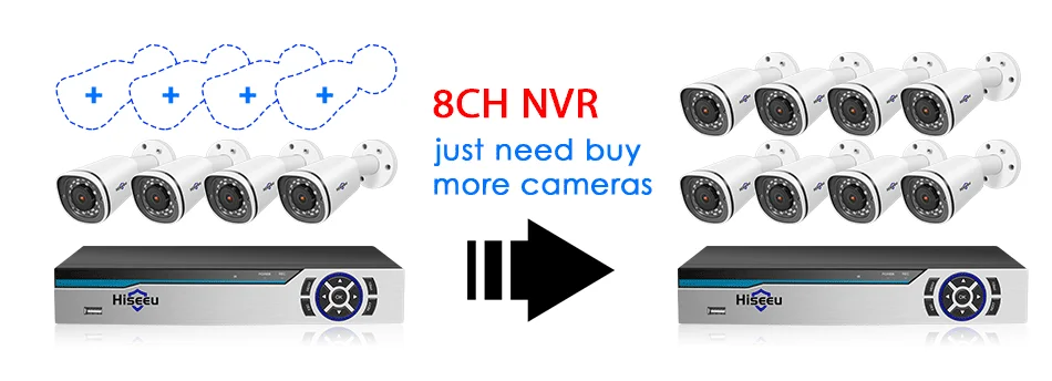 8-канальный NVR дизайн, поддержка подключения до 8 шт камер, вы можете купить Hiseeu ip камеры для расширения вашей системы видеонаблюдения