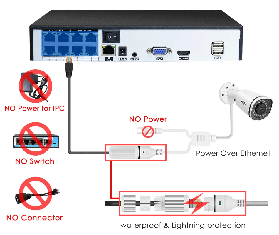 Питание через Ethernet означает, что ip-камеры подключаются к NVR с помощью одного кабеля, который передает данные и питание. Не требуется адаптер питания, более низкий риск утечки электричества и легко настроить.