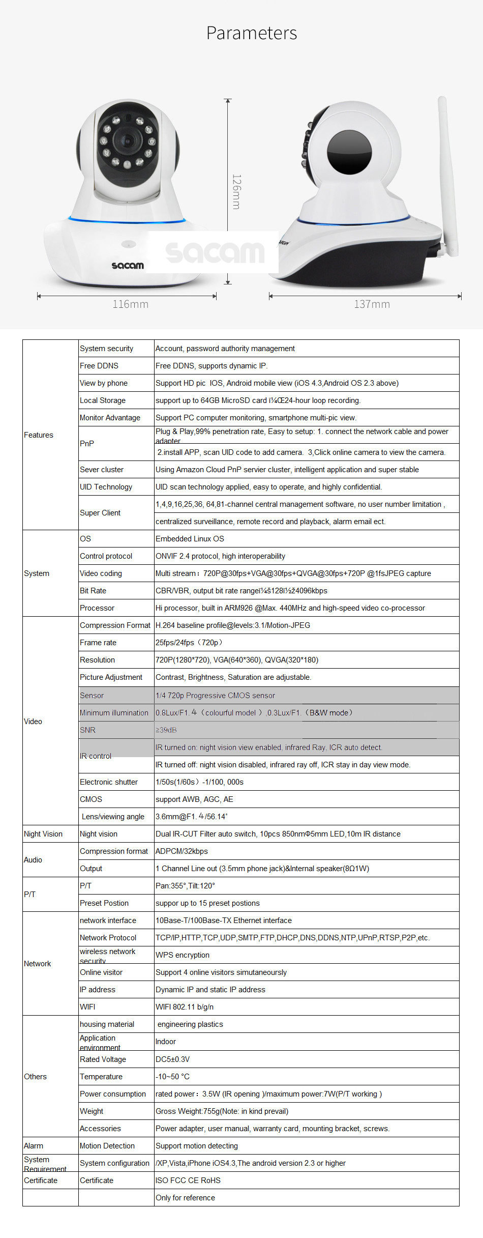 Wi-Fi-N возможность, панорамирование/наклон, удаленный интернет-просмотр, обнаружение движения, ночное видение