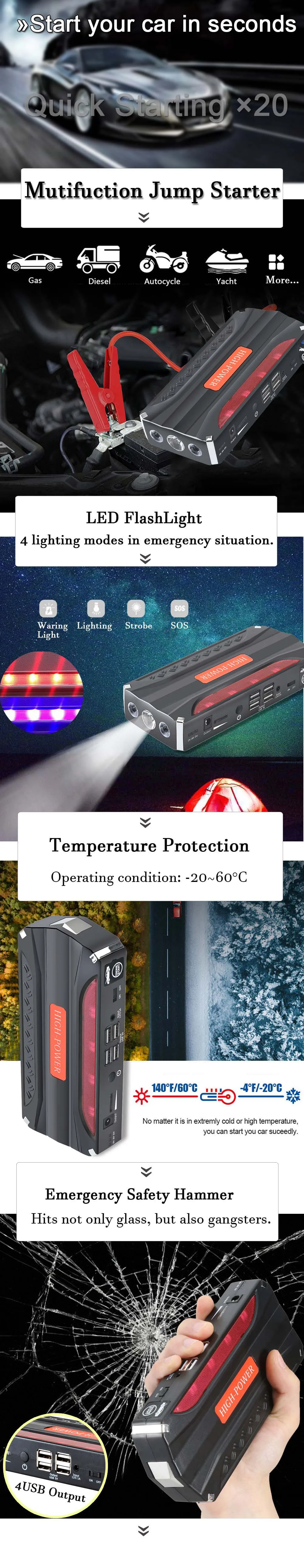 Быстрый запуск 12V бензиновый автомобиль (до 3.5L) и дизельный автомобиль (до 2.5L) за считанные секунды в тех случаях, когда автомобильного аккумулятора. Когда вы путешествуете в небольшом месте, и ваш автомобильный аккумулятор не работает, вы можете использовать этот автомобильный стартер для запуска вашего автомобиля.