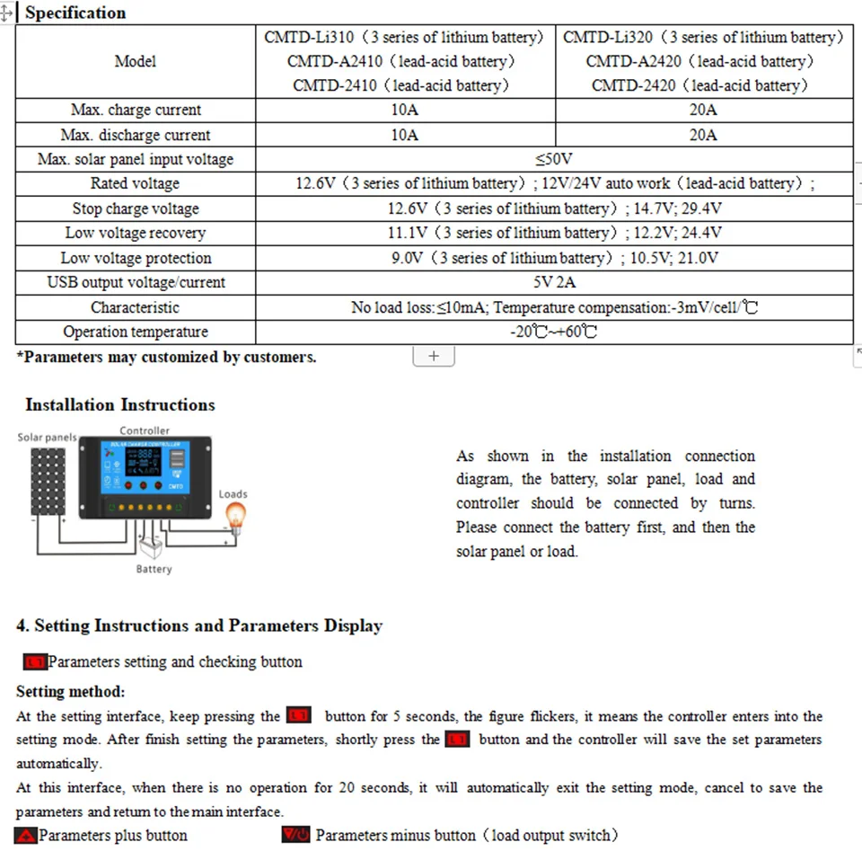 1 шт. (10A /20A/30A/40A может быть выбран) 12V/24V PMW + двойной USB выход управления установкой на солнечной батарее 1 шт. руководство пользователя на английском языке.