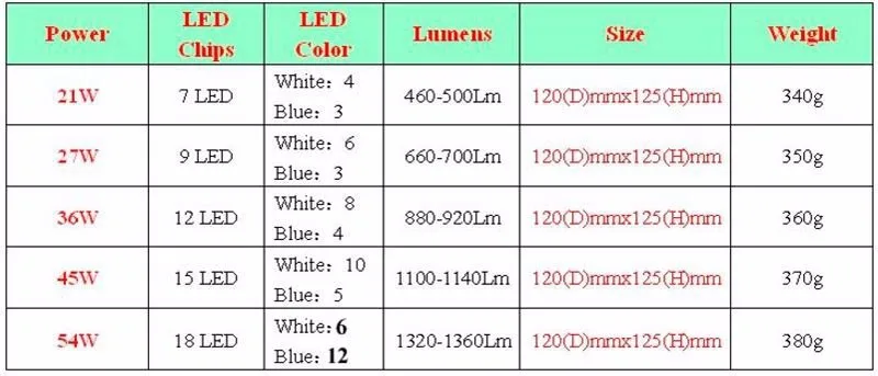 Тип розетки: E27 Напряжение: 85-265 В переменного тока Материал корпуса: высококачественный алюминий С более чем 50000 часов срока службы Особенности: Энергосбережение, низкое энергопотребление Стандартный E27 фитинг дизайн, легко установить Отличная Теплоотдача с алюминиевым корпусом Увеличение урожайности и уменьшение круга роста растений Сертифицировано CE, RoHs Источник: светодиодный светильник Bridgelux 3 Вт Мощность: 15 Вт (3blue2white)/ 21 Вт/27 Вт/36 Вт/45 Вт/54 Вт (12blue 6 Белый/12white6blue) Световой поток: 3240 ~ 3780 лм Угол луча: 60 градусов (лучше всего подходит для растений) Рекомендуемое время освещения: 8 ~ 9 часов Материал корпуса: Алюминий Сертификация: CE & RoHS Светильник: Синий 460 ~ 465nm; Холодный белый 6500 ~ 12000K Применение: Идеально подходит для большинства видов растений во многих областях, таких как гидропоника, парниковое освещение, растение, цветение, плодоношение и т. д.