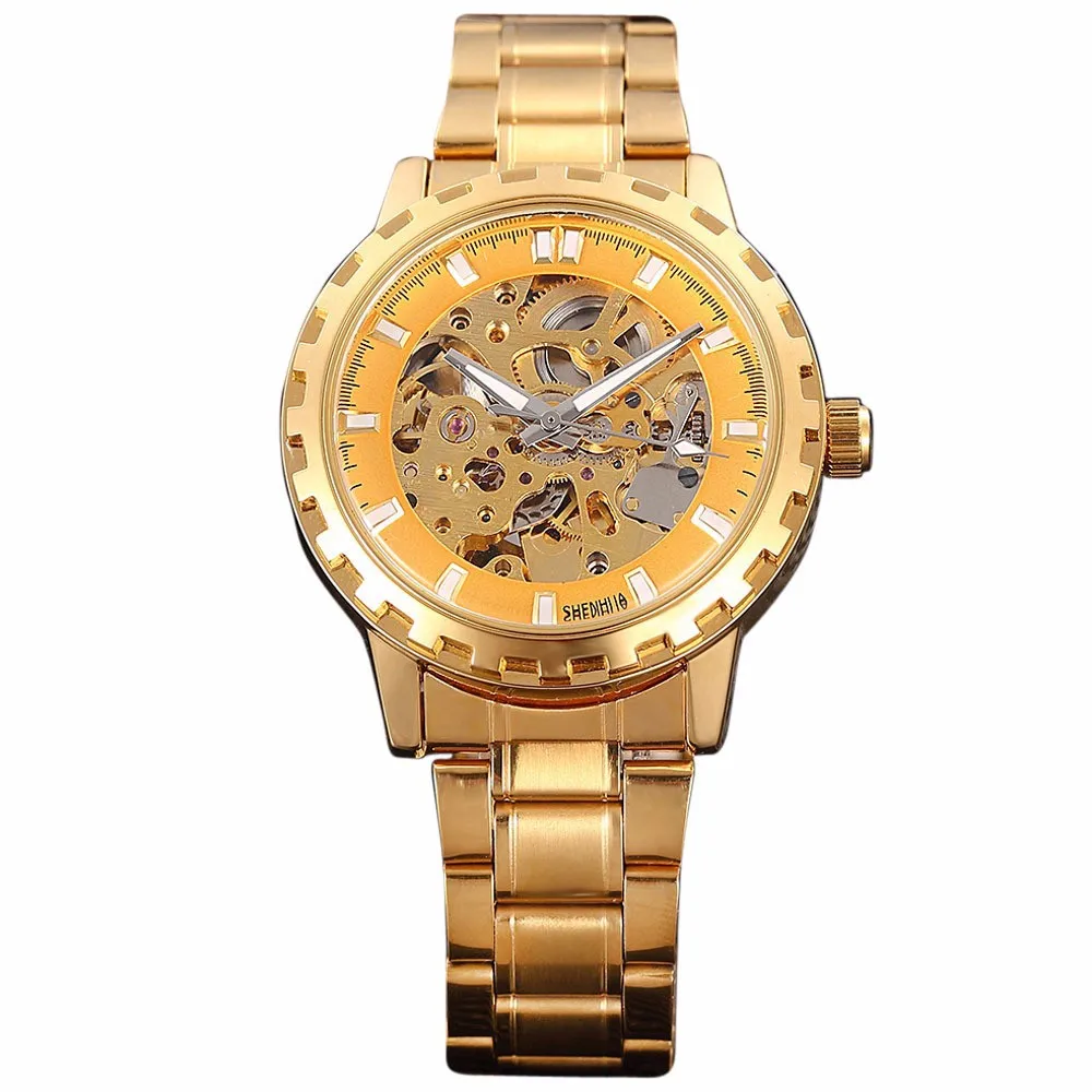 Основные характеристики:1. Роскошный золотой браслет из нержавеющей стали;2. Скелет стимпанк циферблат;3. Автоматическое движение внутри. Характеристики:Чехол диаметр: 4,1 см (1,6 ")Чехол Толщина: 1,4 см (0,5 ")Длина ремешка: 19,0 см (7,5 ")Ширина ремешка: 2,0 см (0,8 ")Тип механизма: самобматывающий механический Посылка включает в себя:-Часы-1 шт.-Руководство по эксплуатации-1 шт.-Пузырчатая пленка