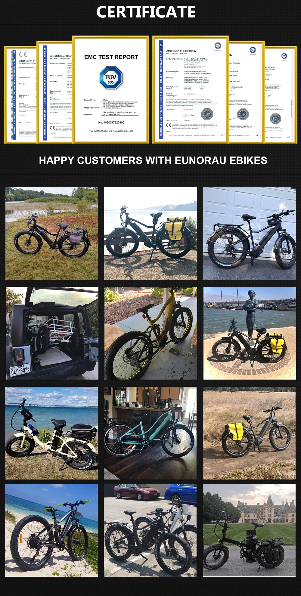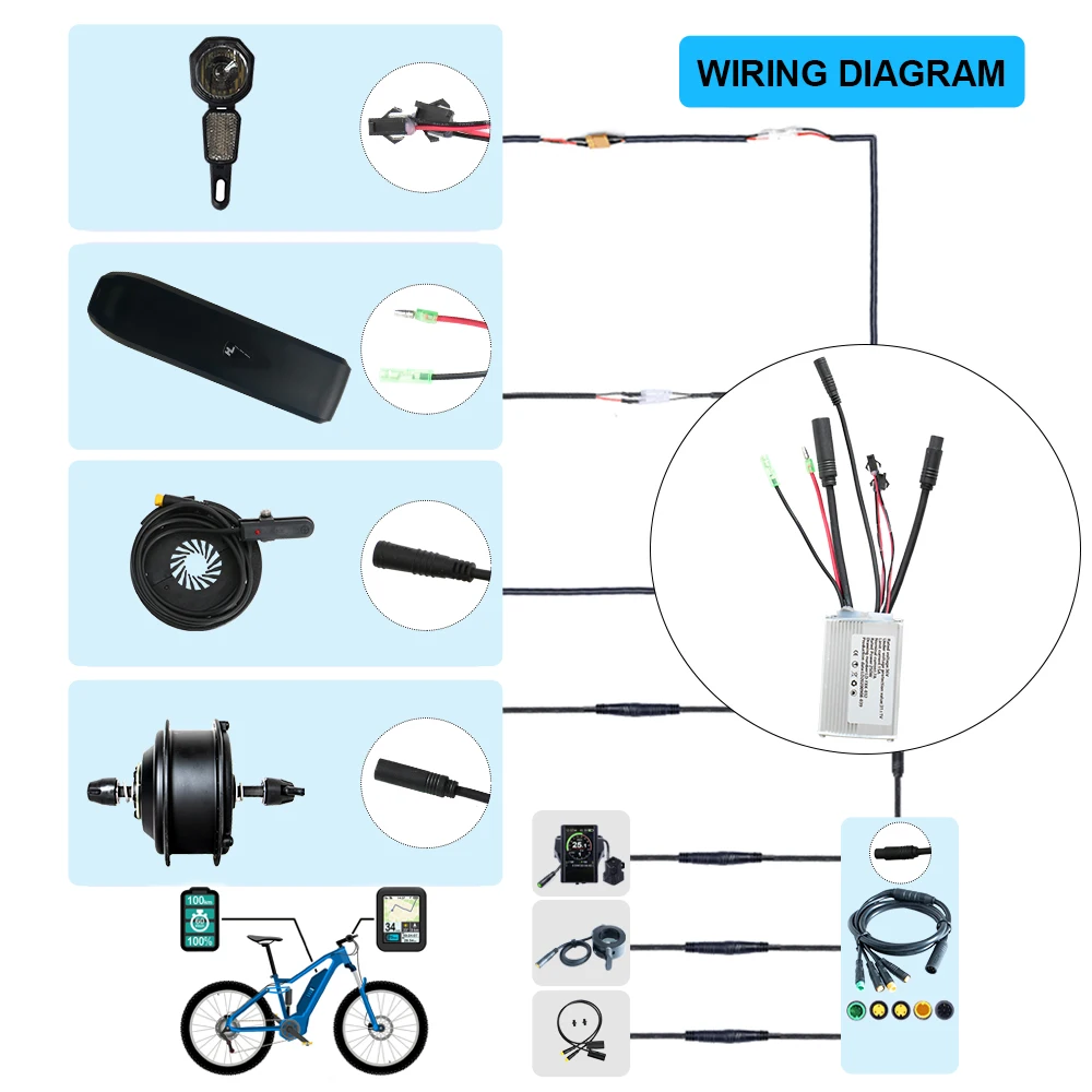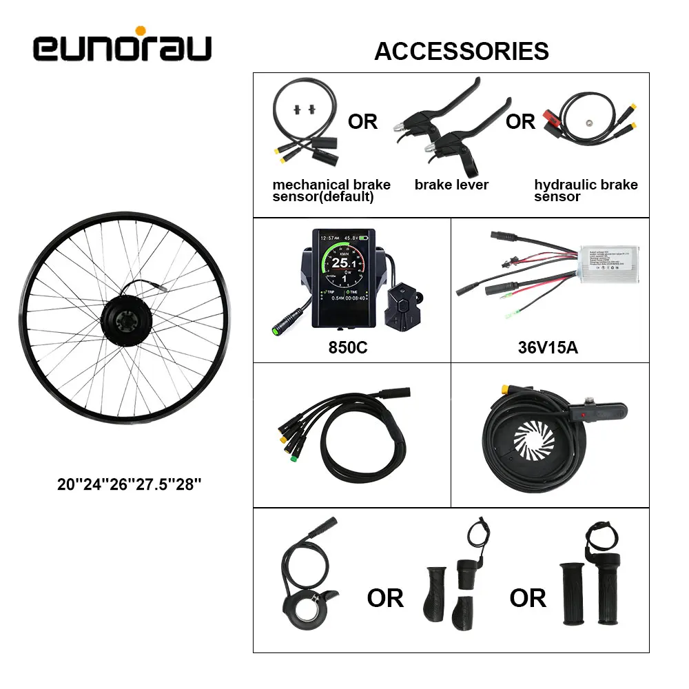 EUNORAU hub motor kits have 36V250W version, 36V350W version, 36V500W version, 48V500W version and 48V1000W version. 250W version, 350W version and 500W version are for street use, 1000W version is for off road use. 250W kit with front and rear wheel motor, sin-wave controller and colorful LCD display with USB plug. 350W kit with rear wheel motor, sine-wave controller, torque sensor and colorful LCD display with USB plug. 500W kit with front and rear wheel motor, sin-wave controller and colorful LCD display with USB plug. The 1000W kit with front and rear wheel motor, sin-wave controller and colorful LCD display with USB plug. It will make your life with fun after making the bike to electric, all the parts is compatible with BBS motor kit from Bafang, so you can select the BBS motor spare parts for this hub motor kit too. If you have motor and battery already, you can buy controller sets from EUNORAU shops too.
