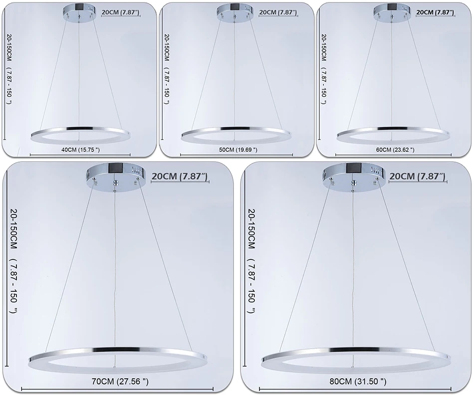 1. Выберите «диаметр 16 Вт 40 см» = диаметр 40 см, 16 Вт, диаметр навеса 20 см. 2. Выберите «диаметр 18 Вт 50 см» = диаметр 50 см, 18 Вт, диаметр навеса 20 см. 3. Выберите "20 Вт диаметр 60 см" = диаметр 60 см, 20 Вт, диаметр навеса 20 см. 4. Выберите "24 Вт диаметр 70 см" = диаметр 70 см, 24 Вт, диаметр навеса 20 см. 5. Выберите "30 Вт диаметр 80 см" = диаметр 80 см, 30 Вт, диаметр навеса 20 см. 6. Все модели имеют длину 150 см, регулируется