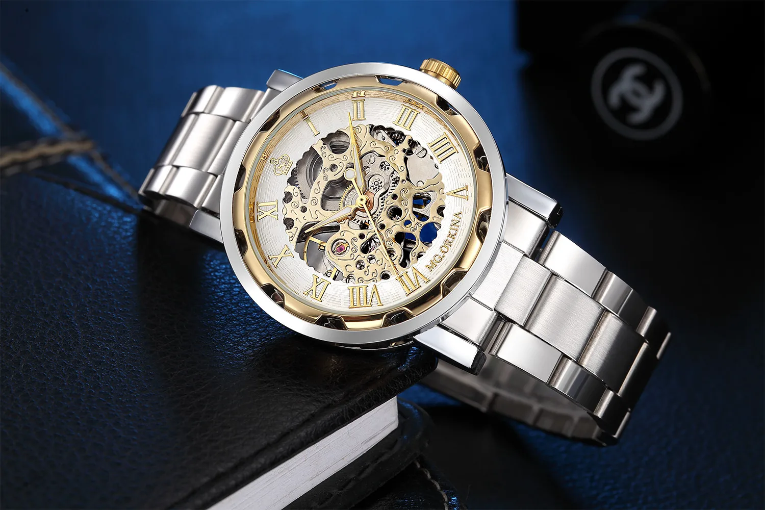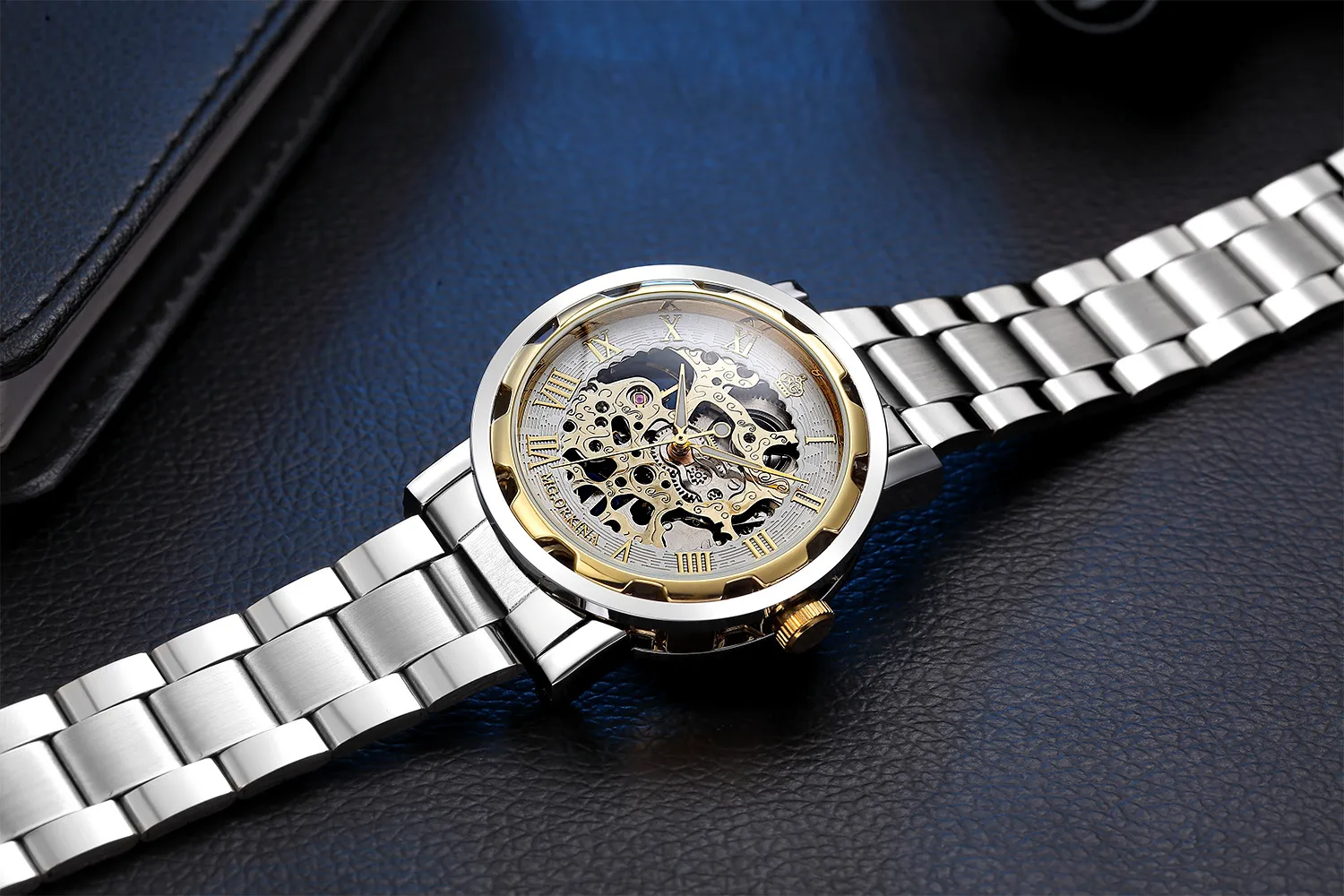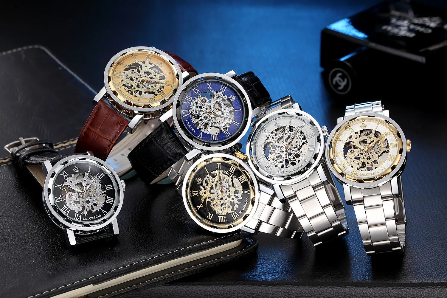 Новые золотые мужские наручные часы с кожаным ремешком, Уникальные повседневные механические часы в стиле стимпанк, мужские часы Heren Horloge Особенности: 100% новый бренд и высокого качества Уникальный дизайн с кожаным ремешком, подходит для мужчин и мальчиков Механические часы с ручным ветром 12 месяцев гарантии Размеры: Диаметр циферблата часов: 4,2 см прибл. Ширина ремешка: 2,00 см, длина: 23 см, чехол Толщина: 1,5 см прибл. Посылка включает в себя: -Оригинальные часы-1 шт. Внимание: Механические часы позволяют время +- 2 минуты в течение 24 часов. Это международные механические часы. Если кто-то заботится, пожалуйста, не покупайте. Спасибо Рекомендации по использованию механических часов: 1. Ручное намоточное движение часов должно быть намотано один раз в день одновременно, чтобы обеспечить достаточно энергии, чтобы управлять часами в течение следующих 24 часов. 2. Автоматический механизм часов энергии от движения пользователя руки. Поэтому вам не нужно вручную наматывать часы под обычный чехол. Возможно, потребуется ручная намотка из-за того, что физическая активность пользователя не достаточно, чтобы управлять часами. Пожалуйста, убедитесь, что заводная головка поворачивается менее чем на 20 кругов. 3. Не надев более 40 часов автоматических часов, поверните заводную головку на 20 кругов, чтобы вновь начать движение системы привода, прежде чем носить ее снова. 4. Чтобы предотвратить попадание влаги в чехол для часов и обеспечить водонепроницаемость, убедитесь, что головка всегда находится в закрытом состоянии.