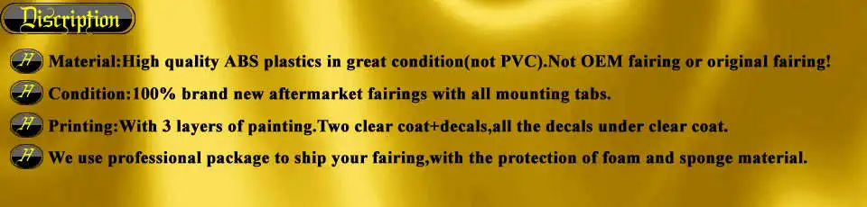 Заявление:Этот комплект обтекателя является aftermarket обтекатель, сделанный в Китае (не OEM или оригинал), 95%-98% такой же, как оригинальный обтекатель. Все детали имеют ту же толщину, что и оригинал,100% приспособление.