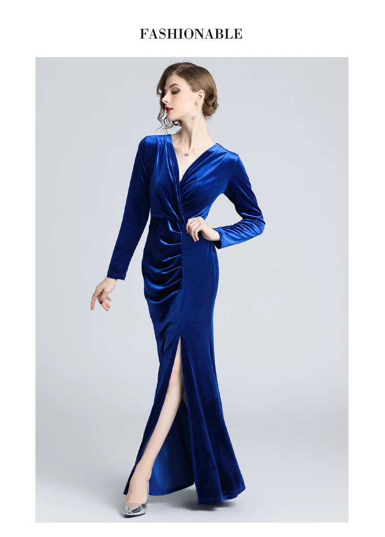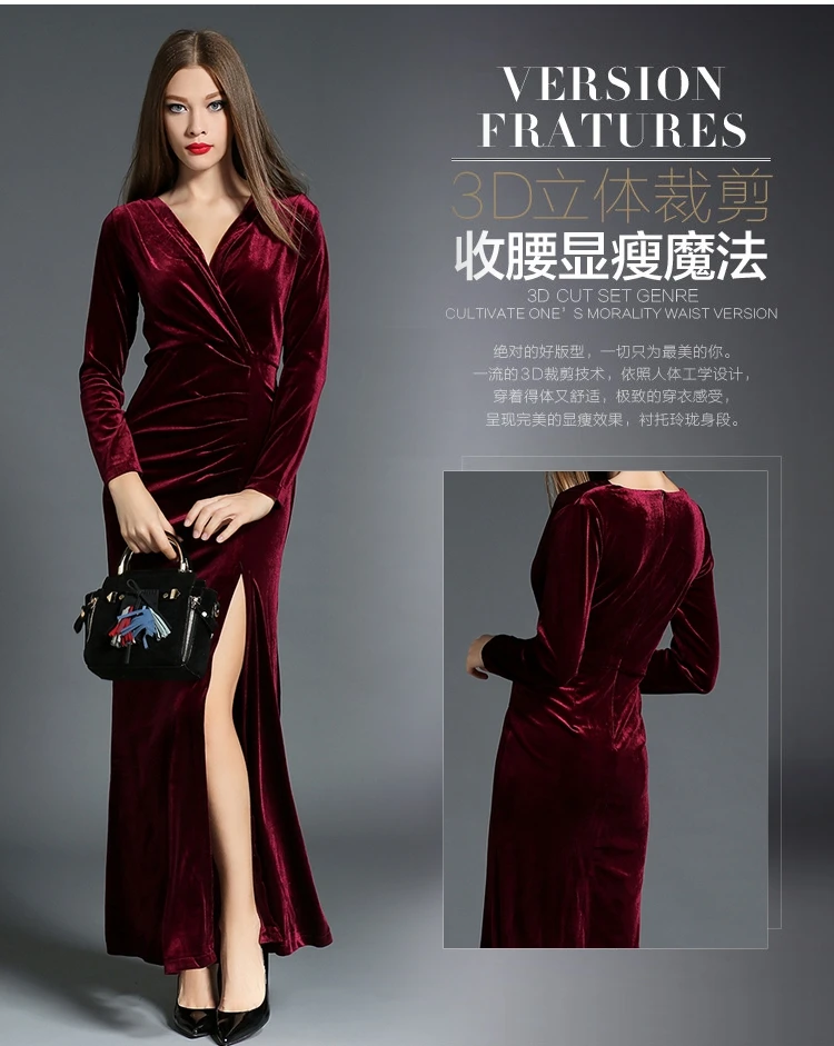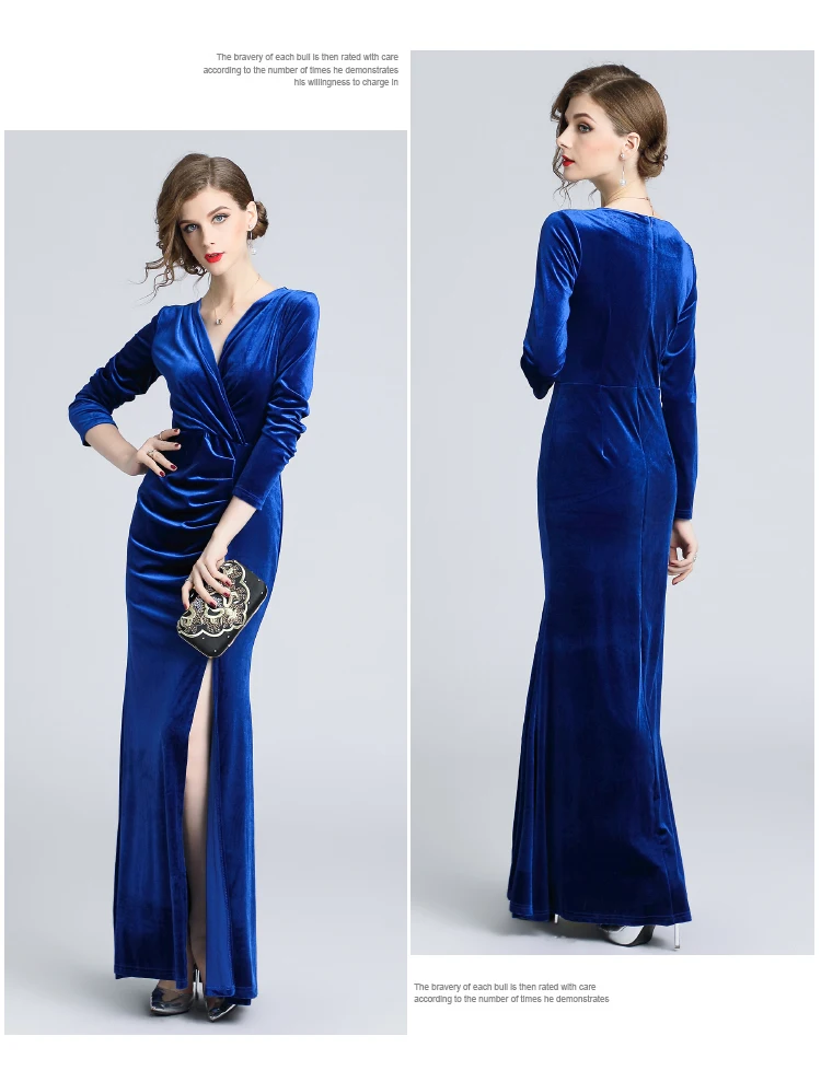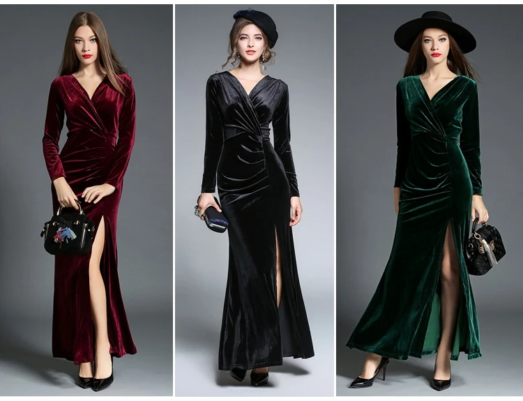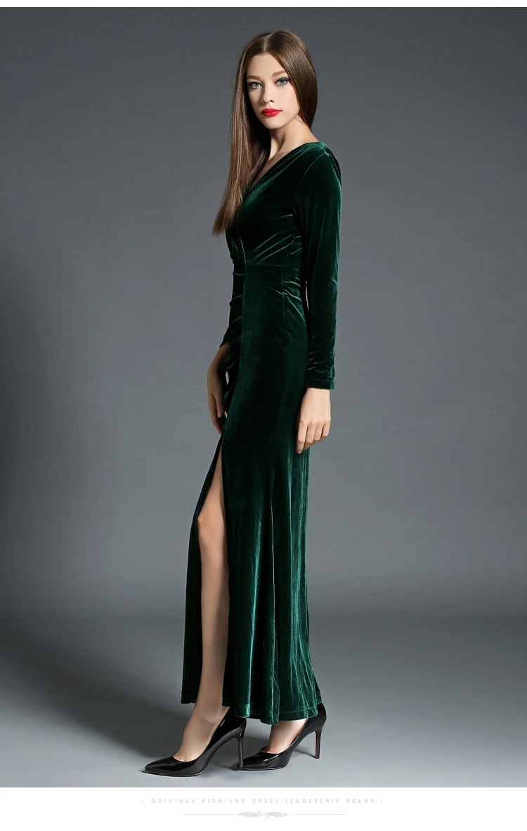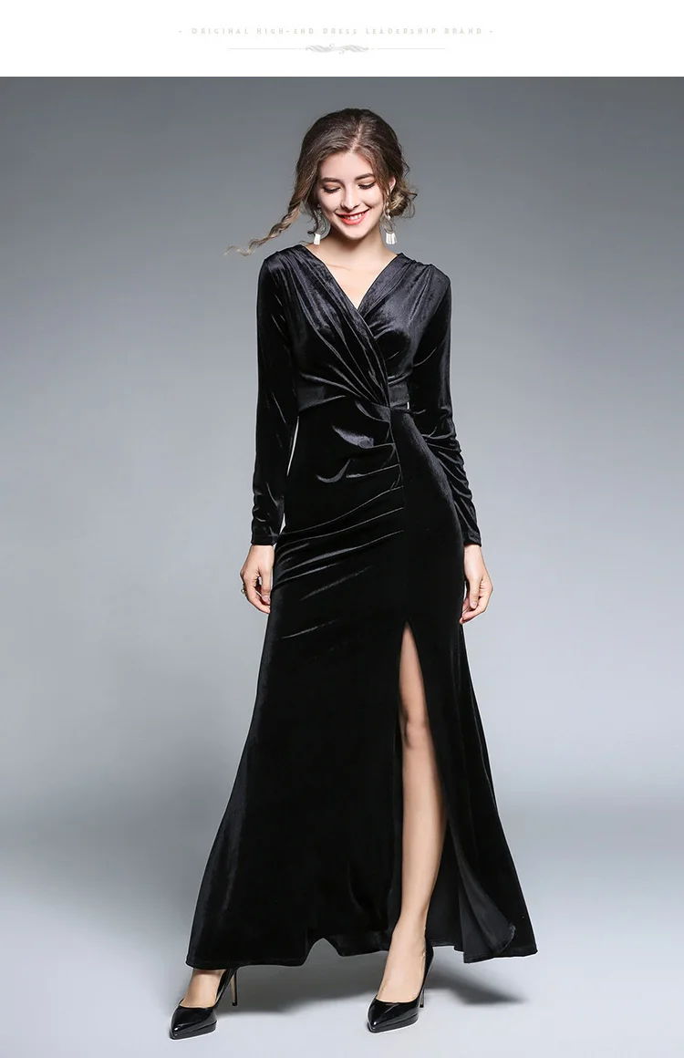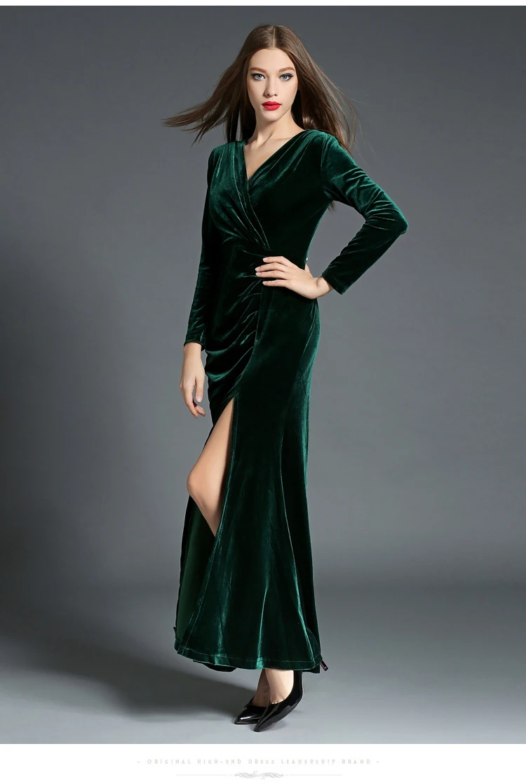 Женское платье макси TingYiLi, черное, красное, зеленое зимнее бархатное платье с длинным рукавом, Длинные Сексуальные вечерние платья