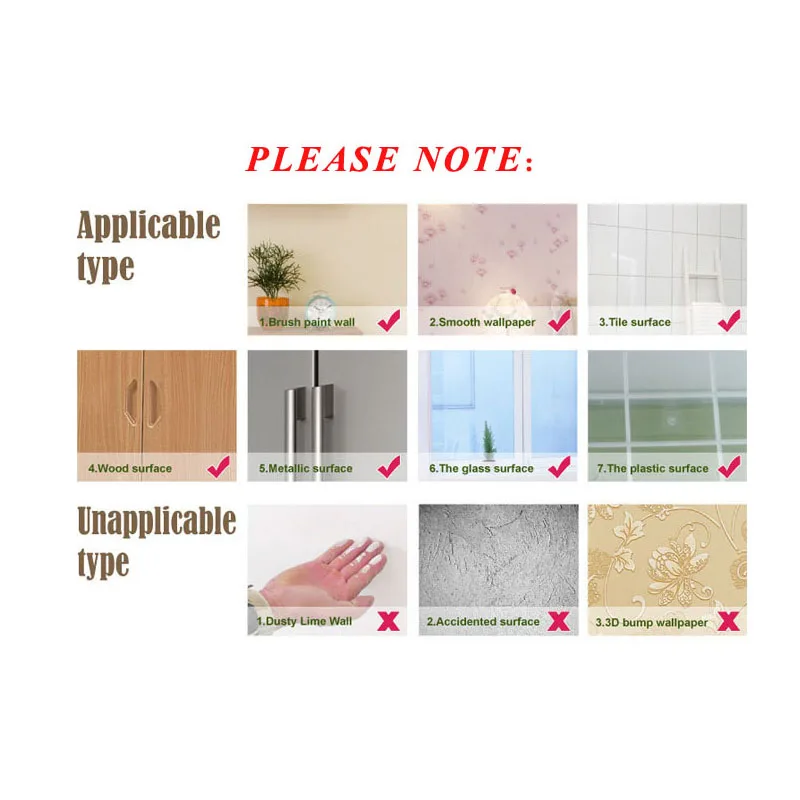 1. Перед нанесением убедитесь, что вы чистите стену сухой тканью/полотенцем, чтобы убедиться, что стена свободна от пыли. 2. Для недавно окрашенных стен, пожалуйста, подождите как минимум 3-4 недели перед нанесением. 3. Убедитесь, что наклейки нанесены на гладкую поверхность, а не на текстуру. 4. Для достижения наилучших результатов, после нанесения наклеек, проведите по наклейкам полотенцем, чтобы получить пузырьки воздуха.