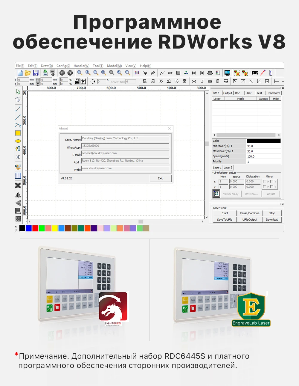 - Прикладное программное обеспечение: RDWorksV8. AutoCAD, CorelDraw и Al plug-in программного обеспечения.