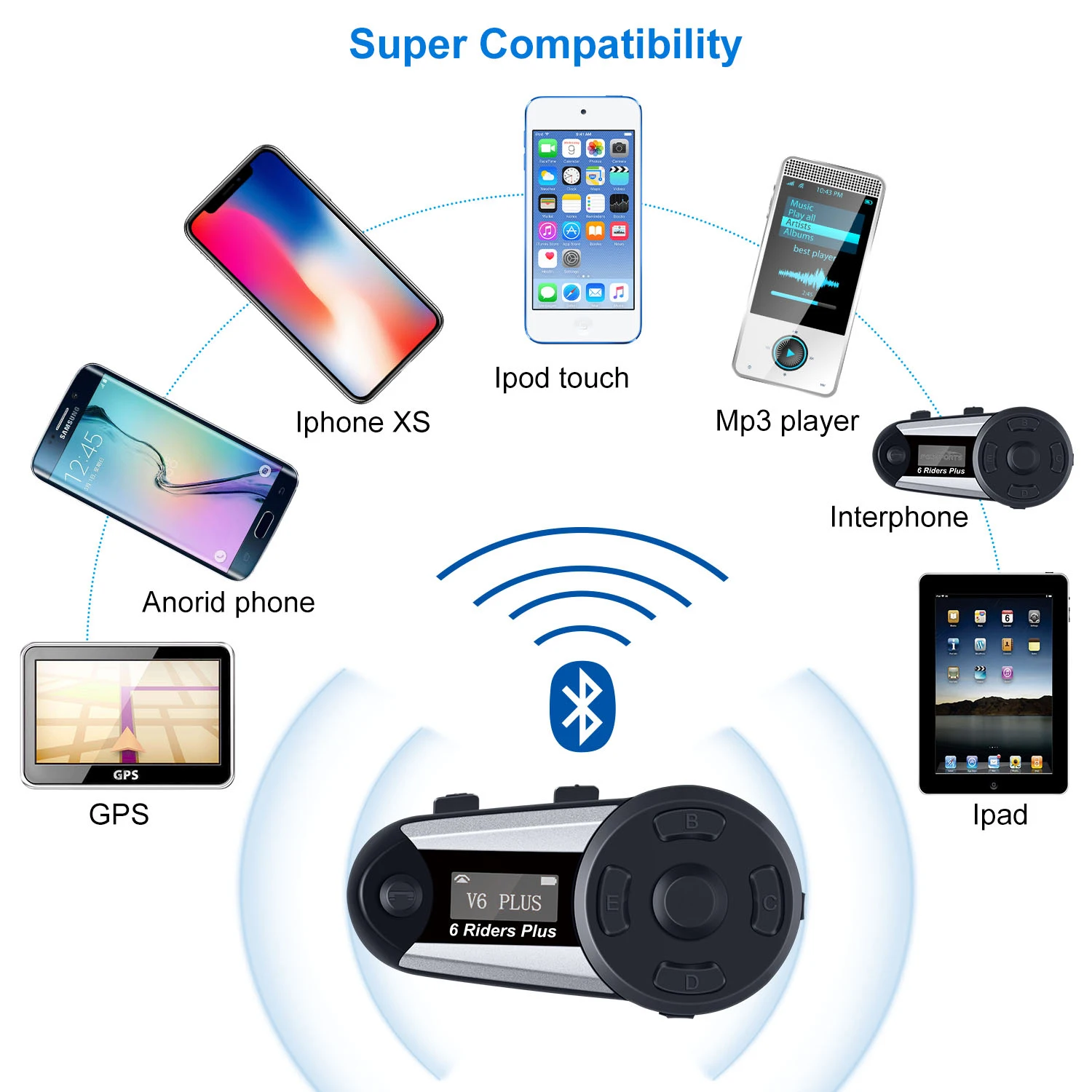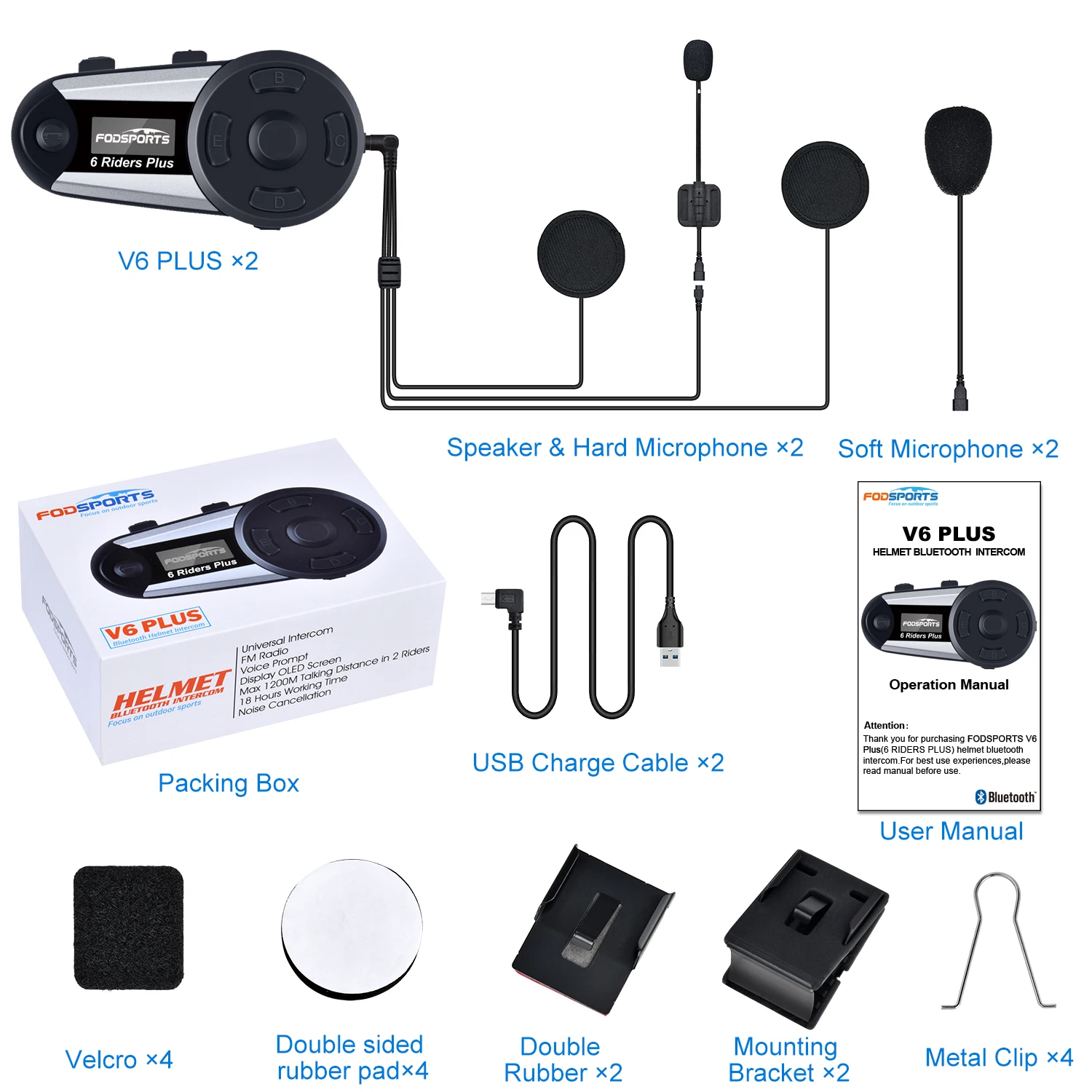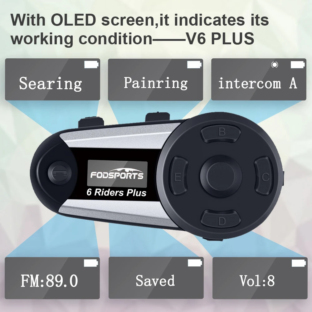 2 шт Fodsports V6 Plus, мотоциклетный шлем, домофон, Bluetooth, шлем, гарнитура, 6 всадников, 1200 м, беспроводной интеркомуникадор, домофон с fm-радио, светодиодный экран