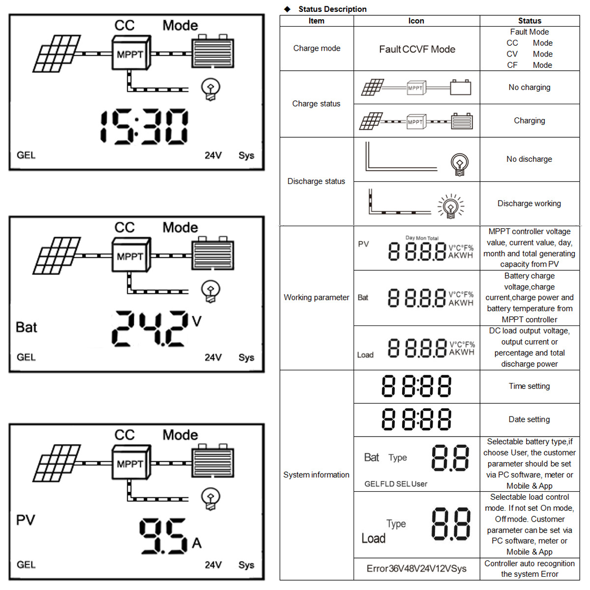 5. Контроллер ЖК-дисплея отображает различные параметры, такие как тип системы, входное напряжение PV, входной ток PV, день, месяц, общая мощность, тип батареи, напряжение батареи, зарядный ток, мощность зарядки, ток нагрузки, потребляемая мощность нагрузки и т. Д.;