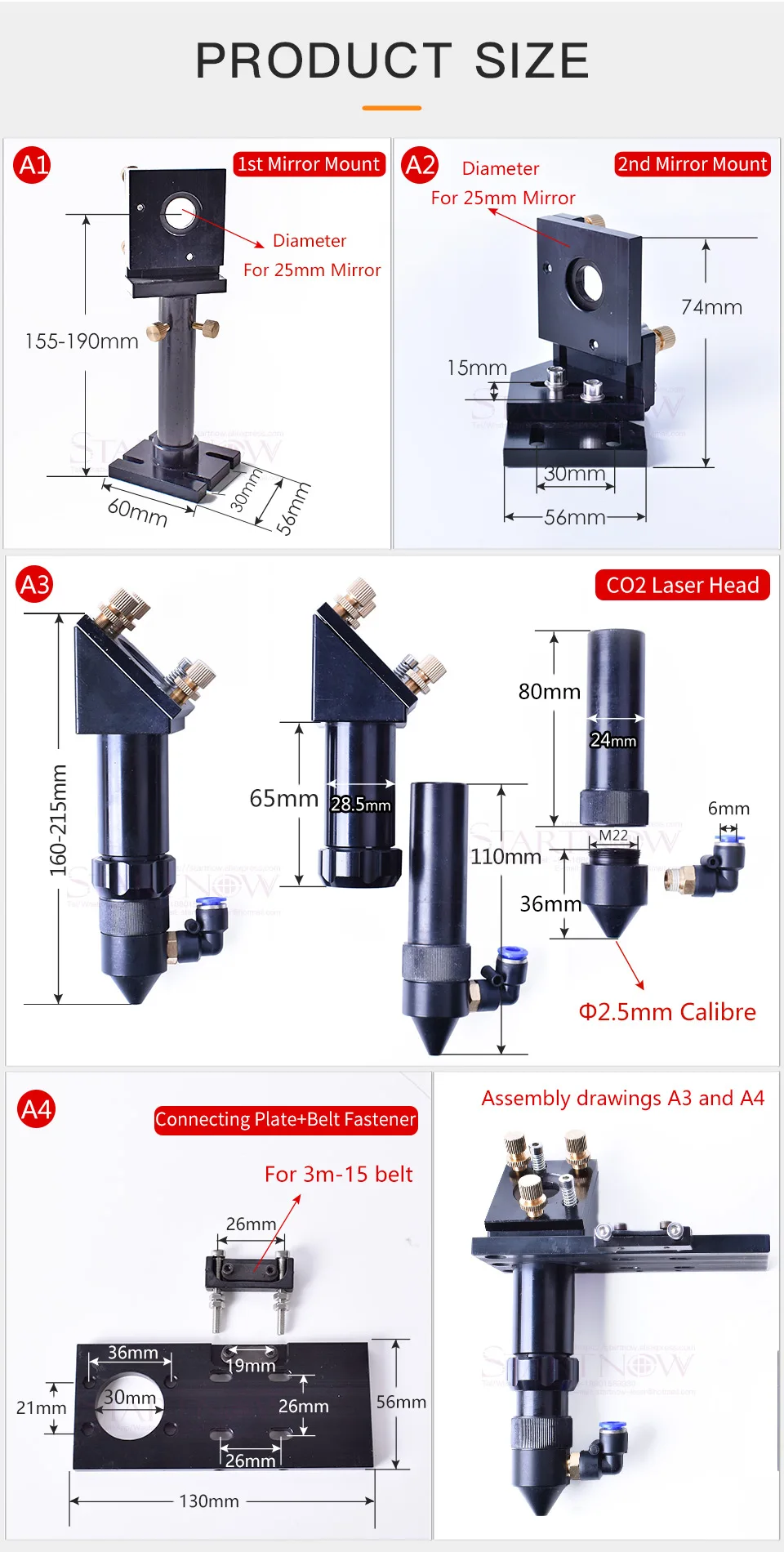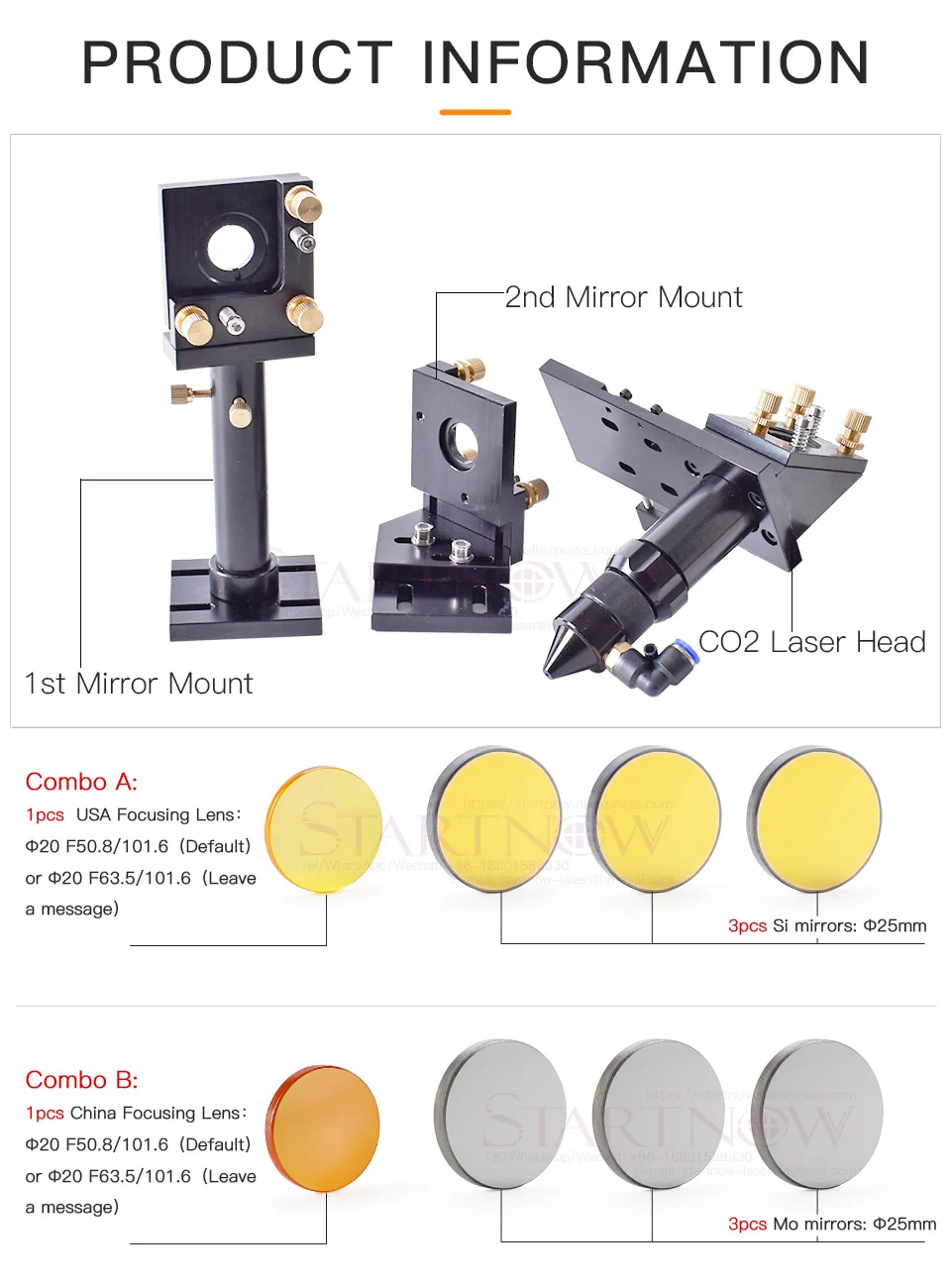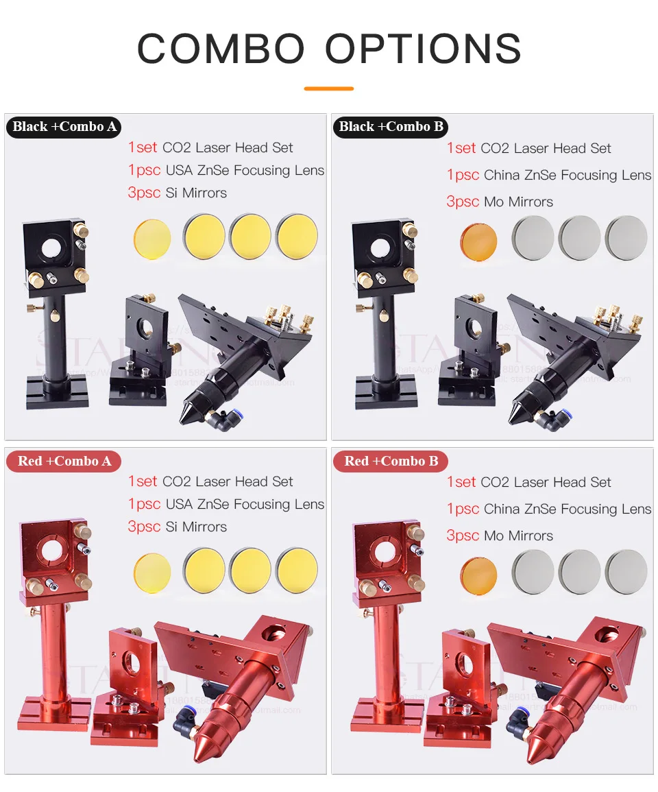 Co2 Laser Head Set + 1 Focus Lens + 3 Mirrors Combo A: 1pc CVD Focus Lens + 3pcs Si Mirrors + Laser Head SetCombo B: 1pc PVD Focus Lens + 3pcs Mo Mirrors + Laser Head SetColour: Red or BlackA4: the connecting plate+belt fastener